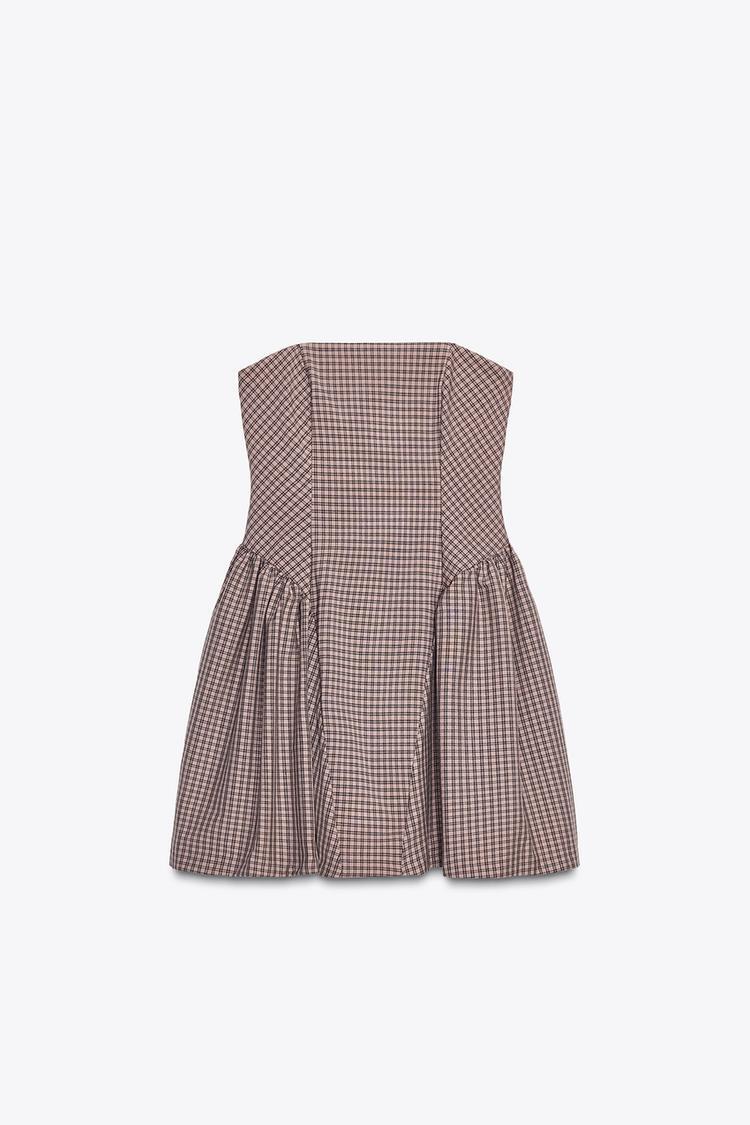 ZARA КОРОТКОЕ ПЛАТЬЕ БЕЗ БРЕТЕЛЕЙ В КЛЕТКУ ВИШИ, ПЫЛЬНЫЙ РОЗОВЫЙ