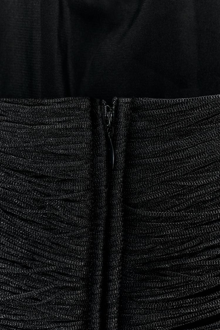 Короткое платье с регулируемой горловиной халтер, завязкой и V-образным вырезом. Декоративная бахрома. Комбинированная подкладка. Застежка на спине: потайная молния в шве и металлический крючок.