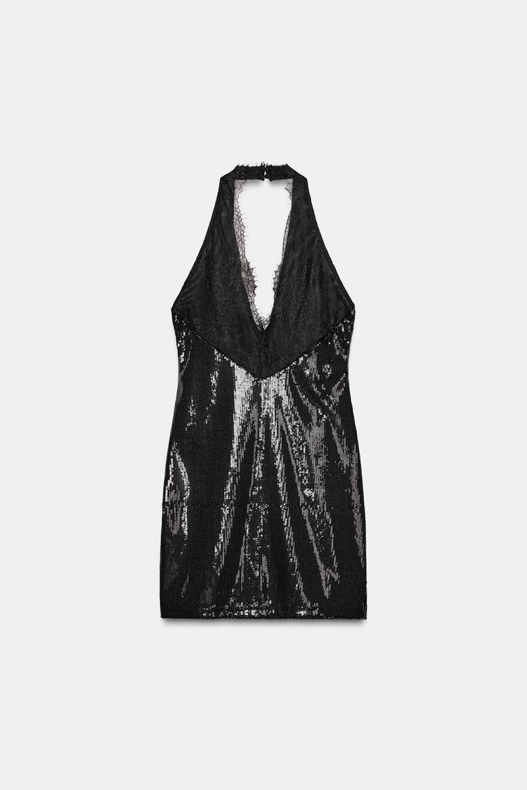 ZARA КОРОТКОЕ ПЛАТЬЕ ХАЛТЕР С ПАЙЕТКАМИ, ЧЕРНЫЙ