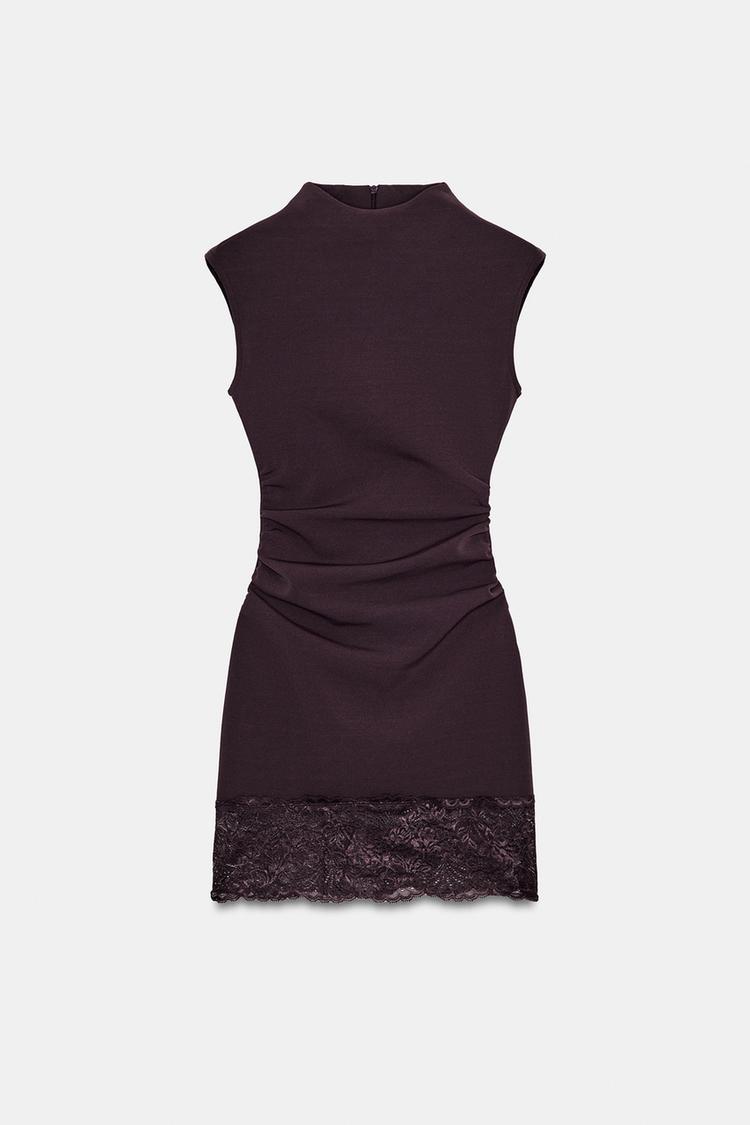 ZARA КОРОТКОЕ ПЛАТЬЕ ИЗ ЭЛАСТИЧНОЙ ТКАНИ С КРУЖЕВОМ, ТЕМНО-КОРИЧНЕВЫЙ