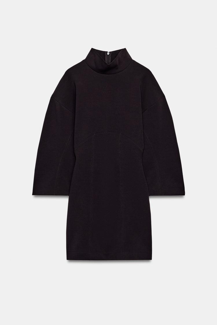 Короткое платье, выполненное из эластичного и гибкого трикотажа с плотным переплетением, мягкого и матового. Высокий воротник и длинные рукава. Прямой подол. Застежка‑молния сзади.