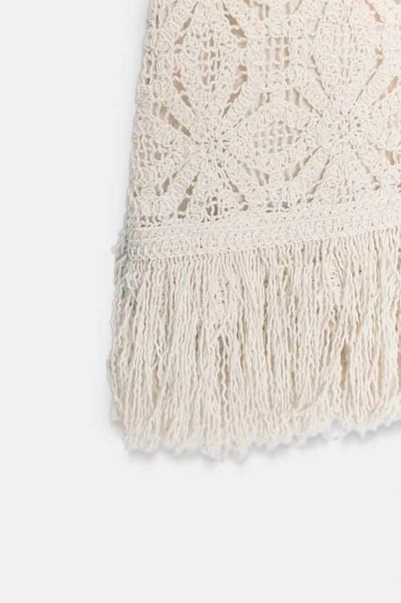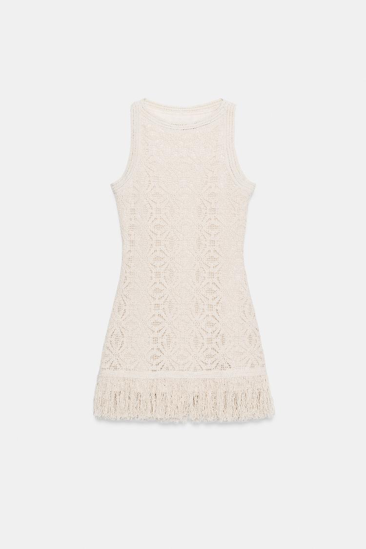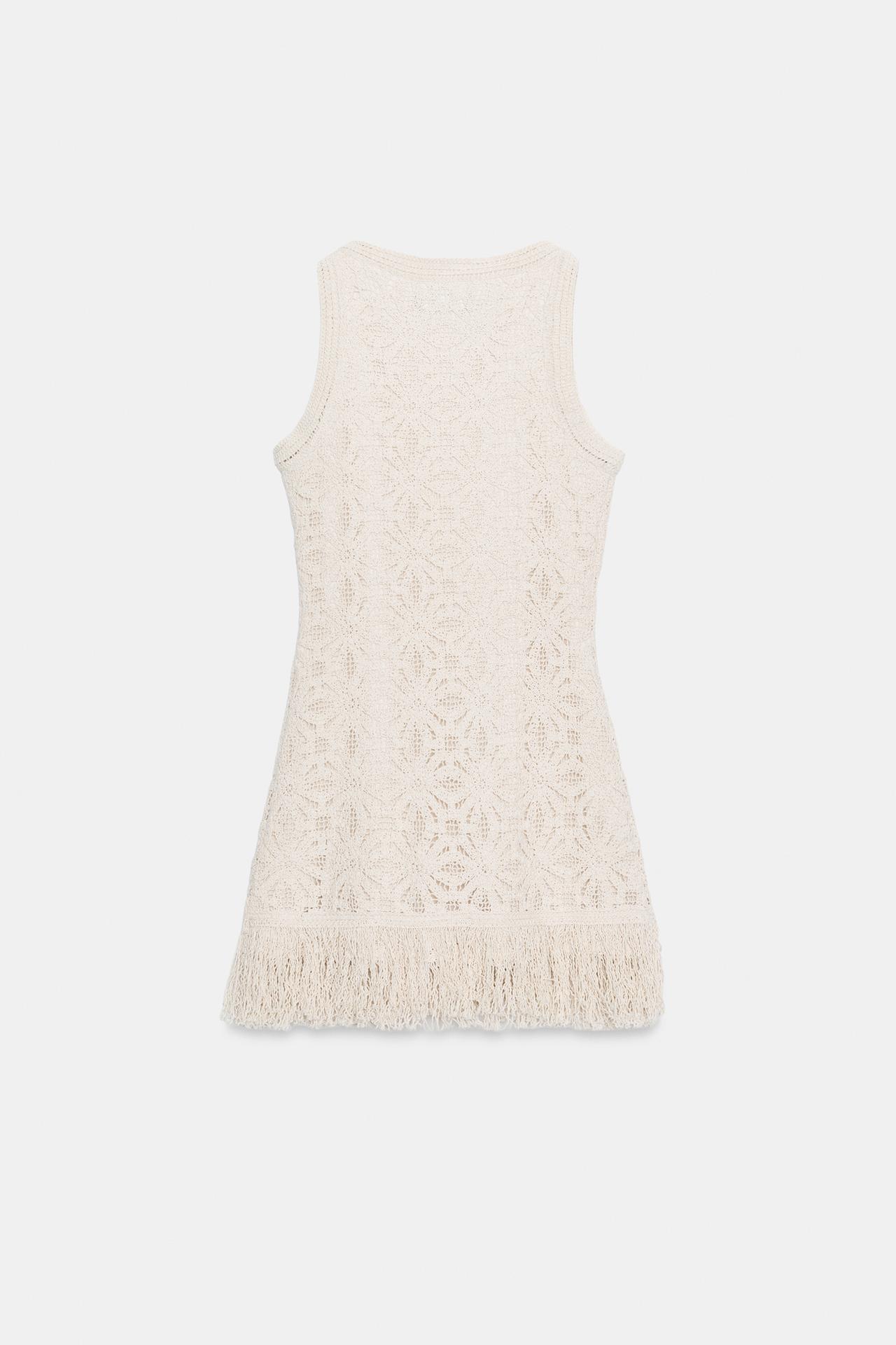 ZARA КОРОТКОЕ ПЛАТЬЕ ИЗ КРУЖЕВА КРОШЕ С БАХРОМОЙ, СВЕТЛО-БЕЖЕВЫЙ