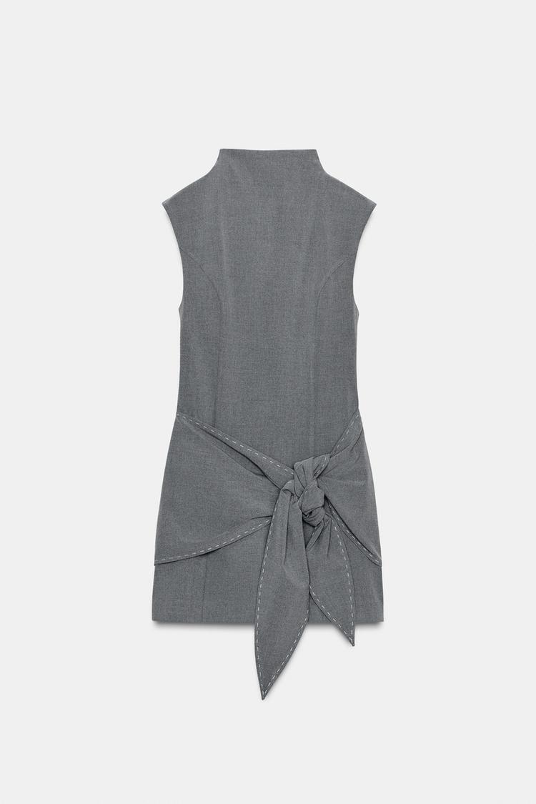 ZARA КОРОТКОЕ ПЛАТЬЕ С ЗАВЯЗКАМИ И ОТДЕЛОЧНОЙ СТРОЧКОЙ, СВЕТЛО-СЕРЫЙ