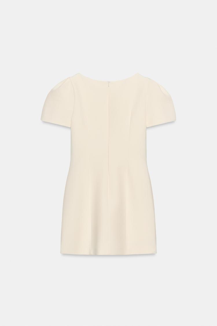 Короткое платье с вырезом лодочкой и короткими рукавами со складками. Ложные прорезные карманы спереди. Отделка строчкой. Потайная застежка-молния сзади.