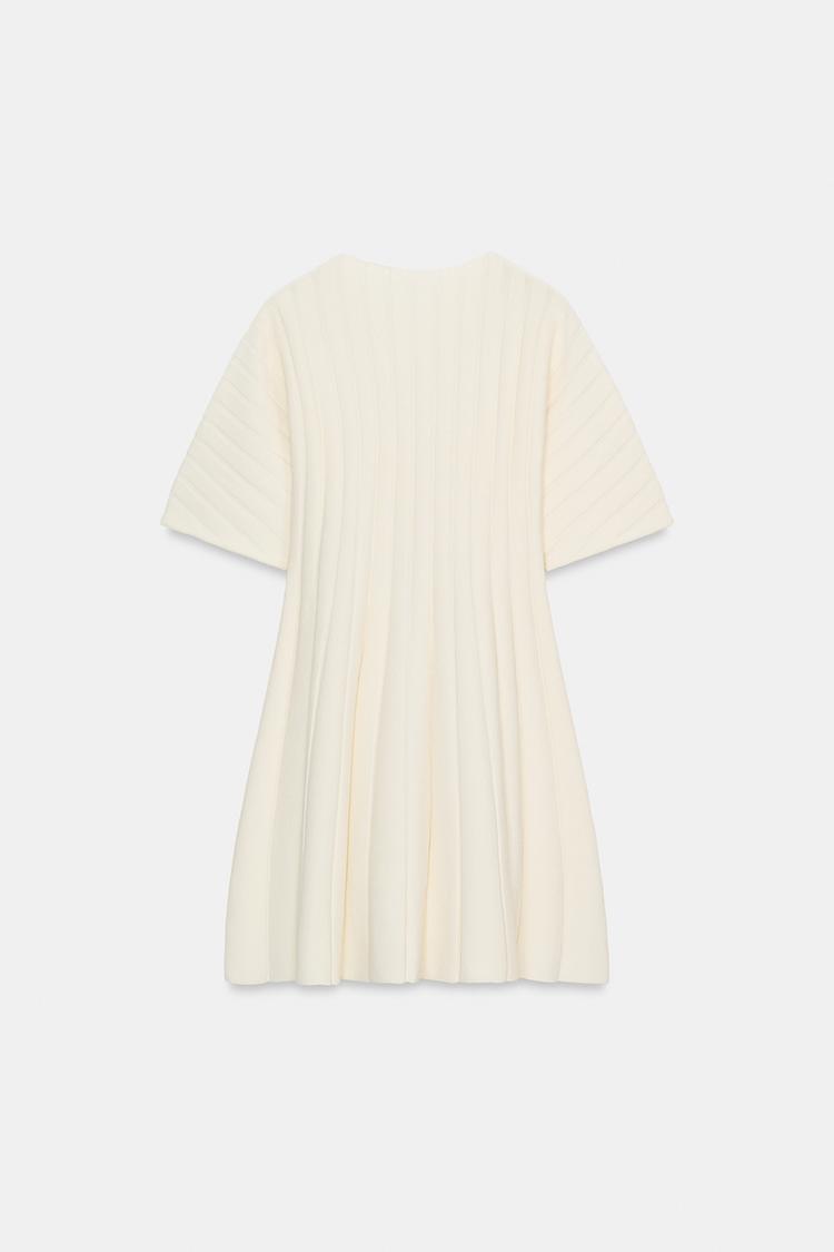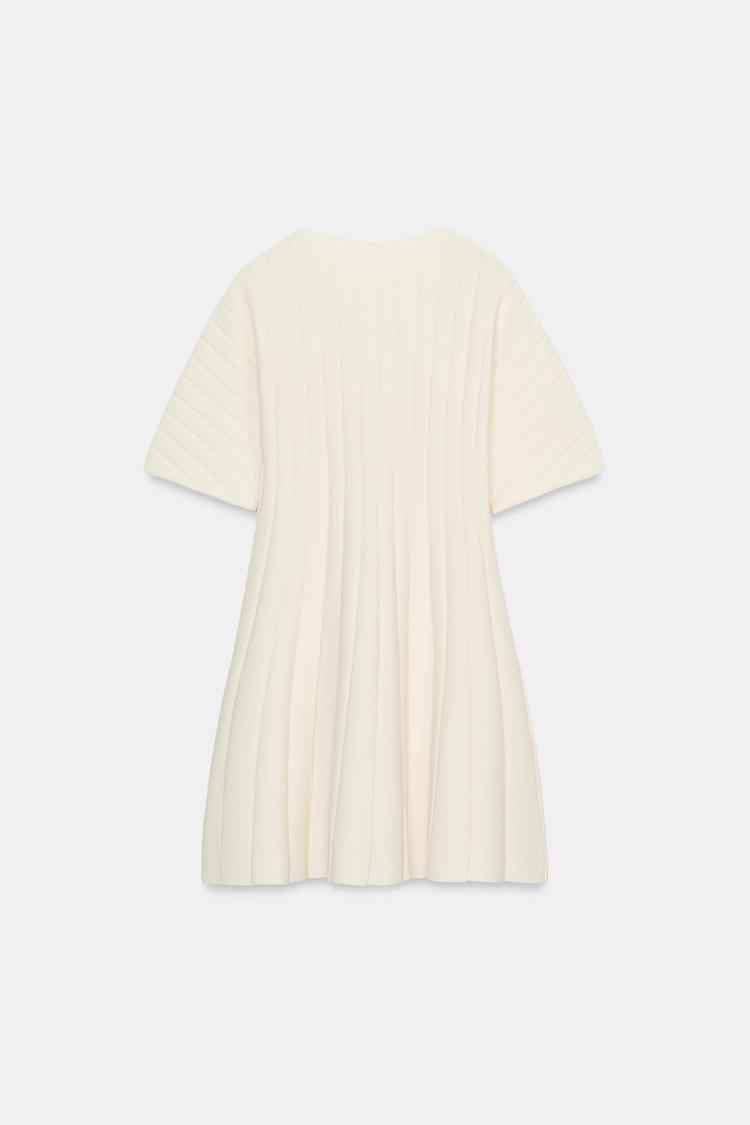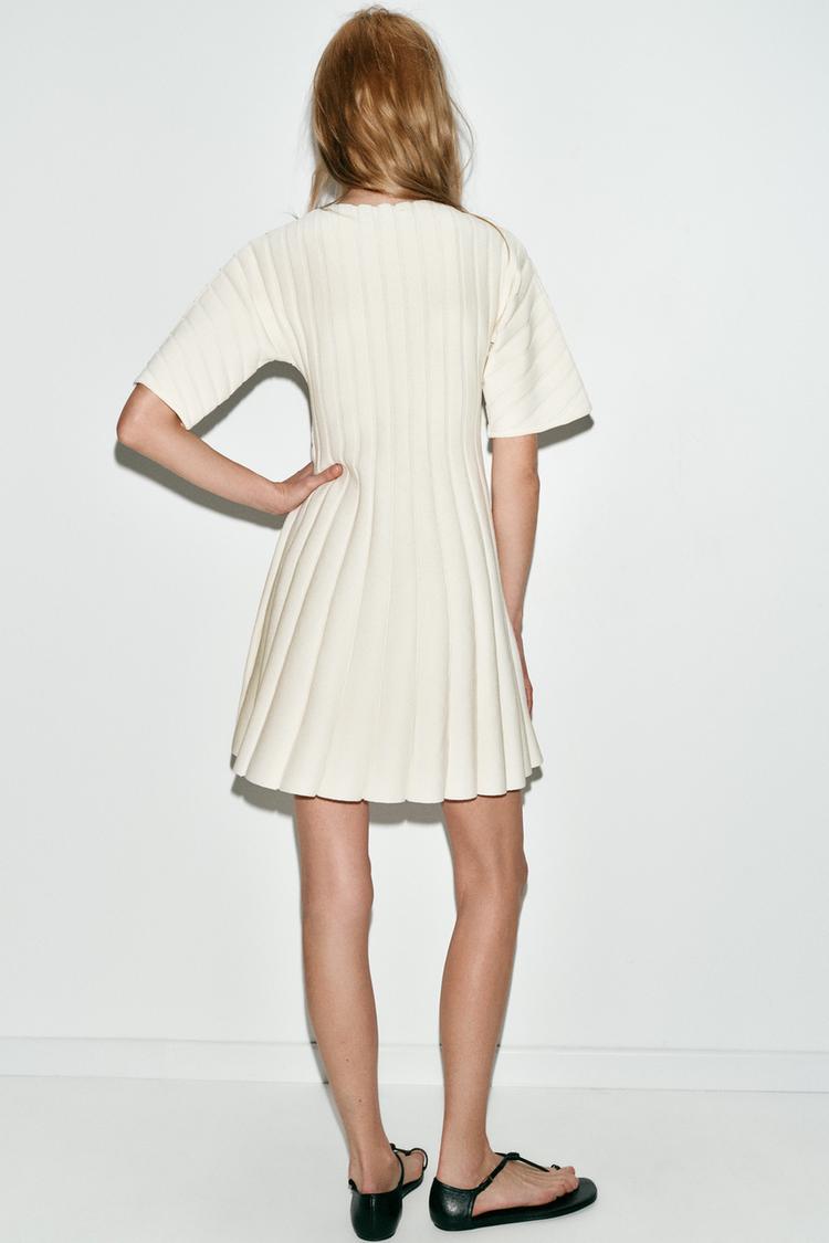 Короткое платье в рубчик с круглым вырезом и объемными короткими рукавами.