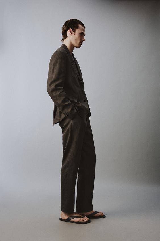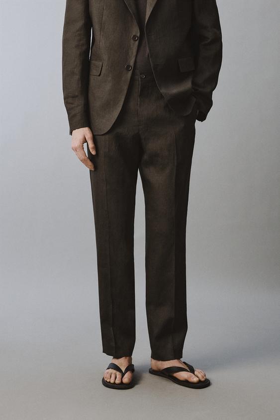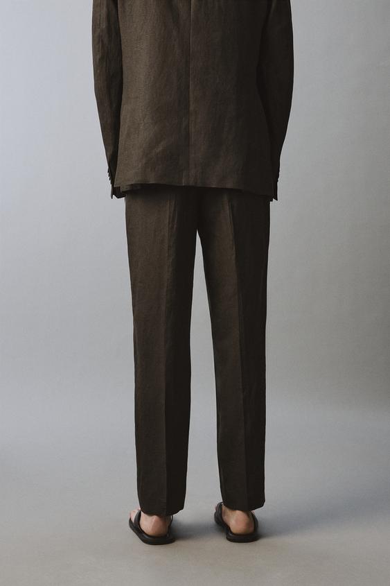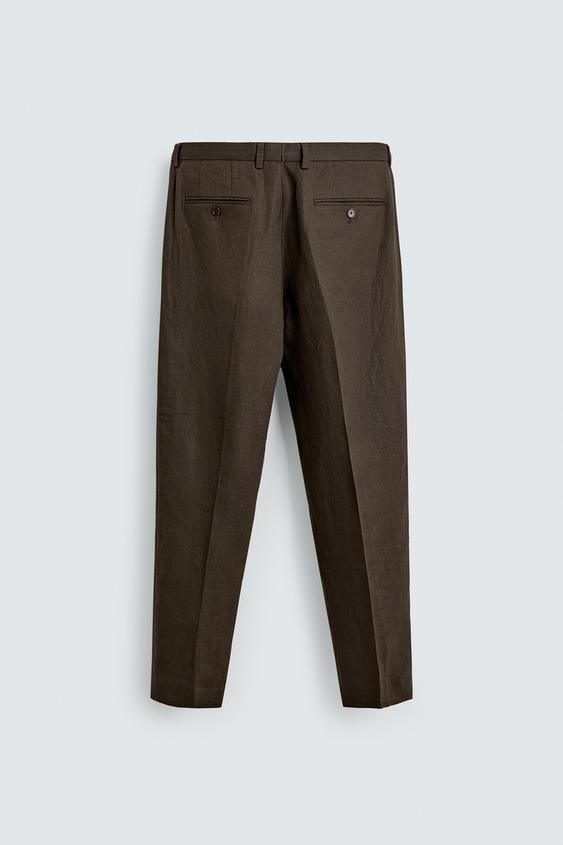 ZARA КОСТЮМНЫЕ БРЮКИ ИЗ 100% ЛЬНА, ТЕМНО-КОРИЧНЕВЫЙ