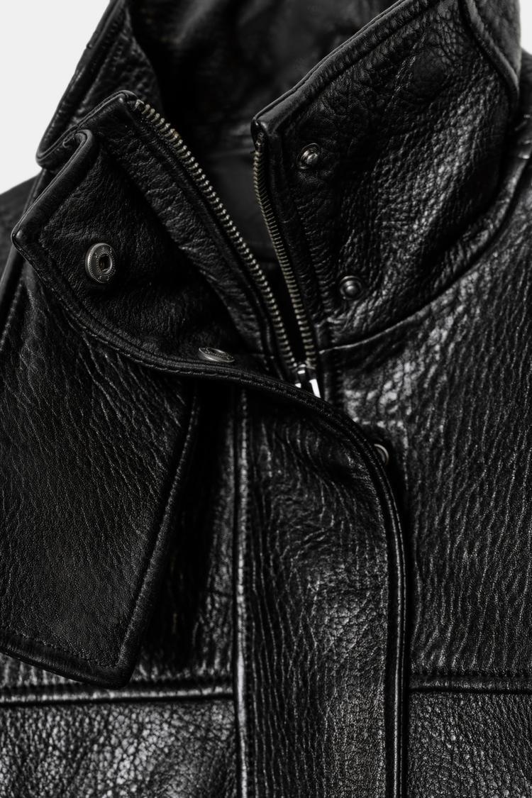 Кожаная куртка на 100% из кожи с высоким воротником и длинными рукавами с завязками и пуговицами. Имеет регулируемую талию с внутренними шнурами и кулисками, передние накладные карманы и внутренний карман. Имеет внутреннюю подкладку и застежку-молнию спереди с скрытой планкой на кнопках.