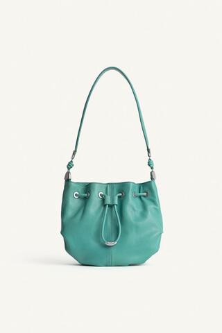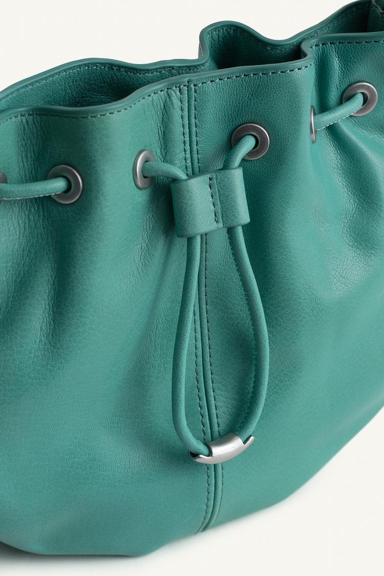 Кожаная мини-сумка через плечо. С отстрочкой по верху и металлическими люверсами. Внутренний карман на молнии. Плечевой ремень с металлической аппликацией. Застегивается на шнурок.