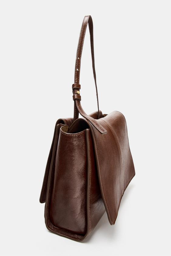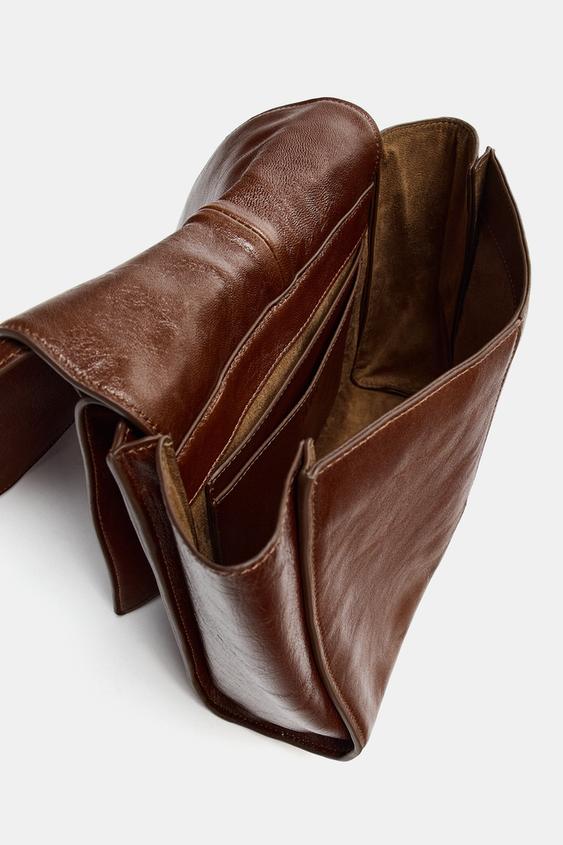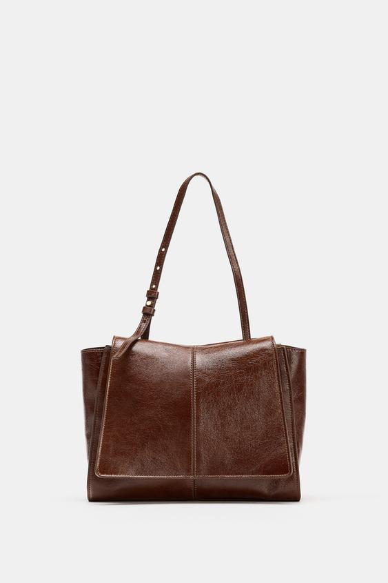 ZARA КОЖАНАЯ МИНИ-СУМКА-ШОПЕР С ДВОЙНЫМ КАРМАНОМ, КОРИЧНЕВЫЙ