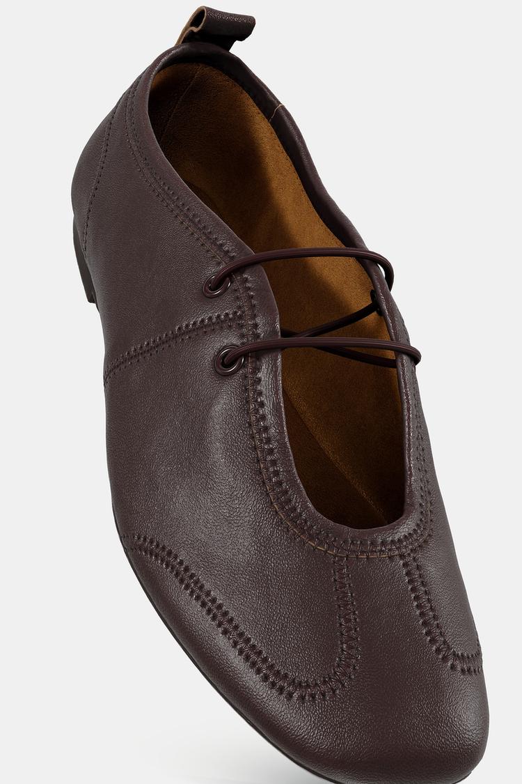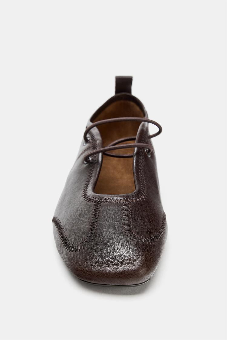 ZARA КОЖАНЫЕ БАЛЕТКИ СО ШНУРОВКОЙ, КОРИЧНЕВЫЙ