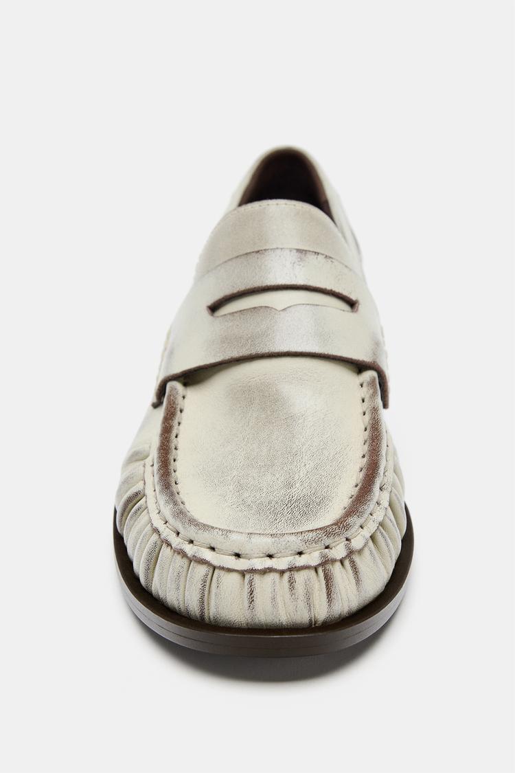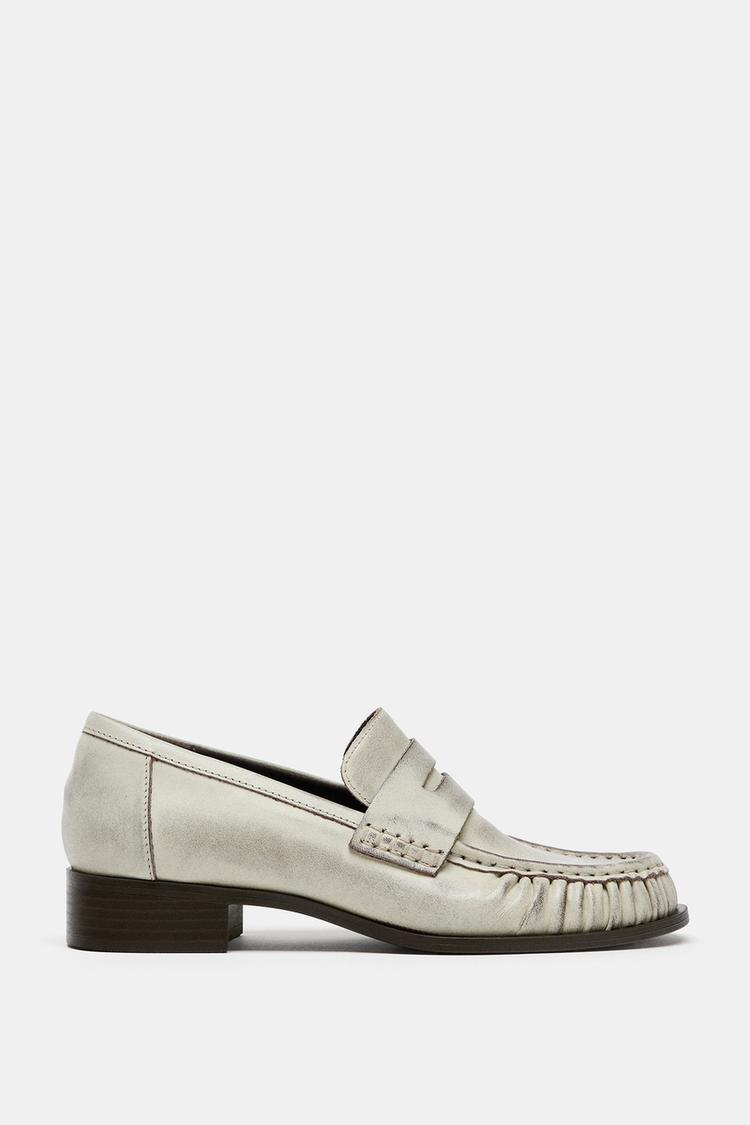 ZARA КОЖАНЫЕ ЛОФЕРЫ СО СБОРКАМИ, БЕЛЫЙ