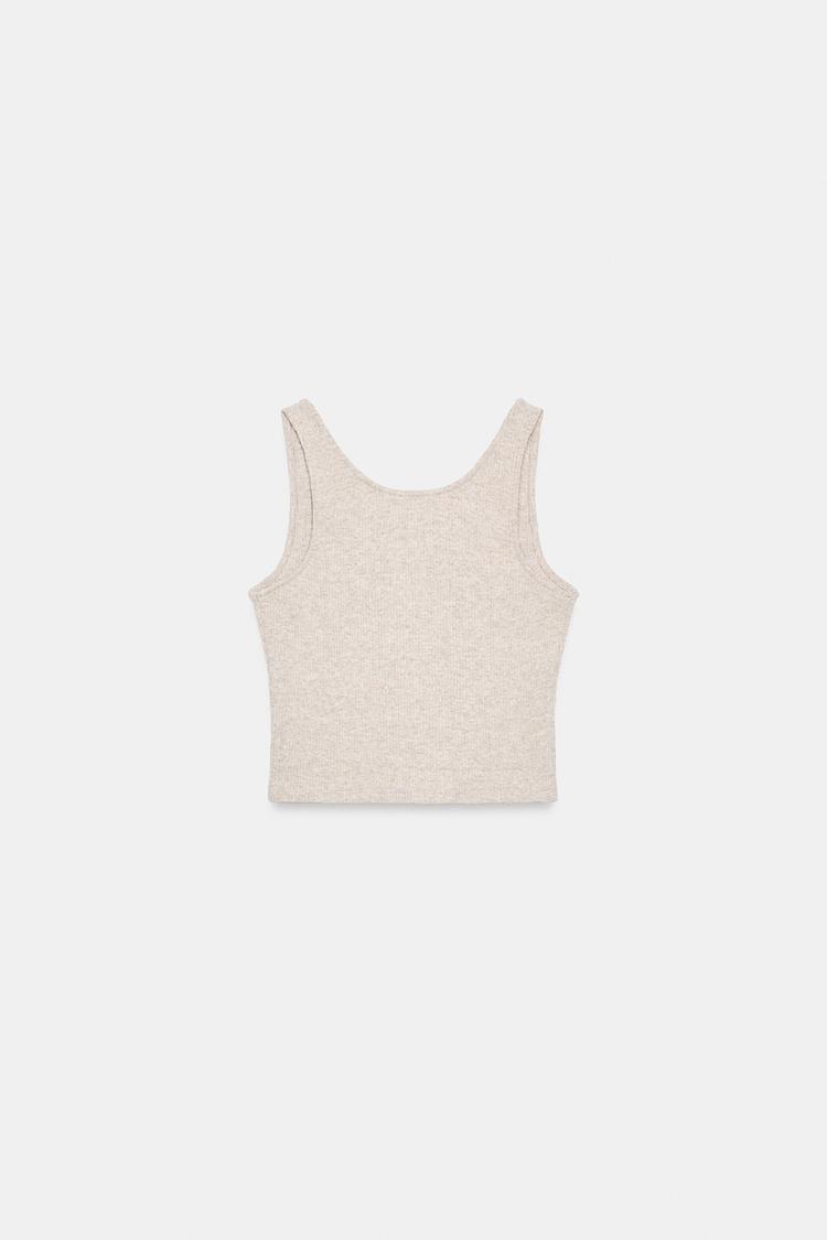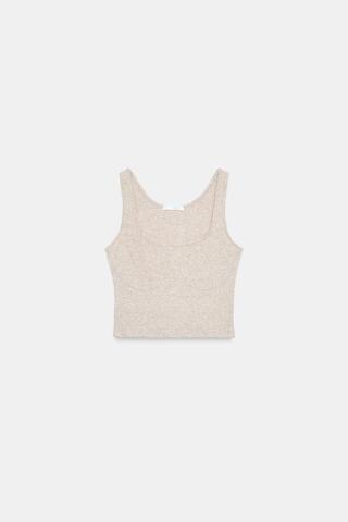 ZARA КРОП-ТОП НА БРЕТЕЛЯХ В РУБЧИК, БЕЖЕВЫЙ МЕЛАНЖ
