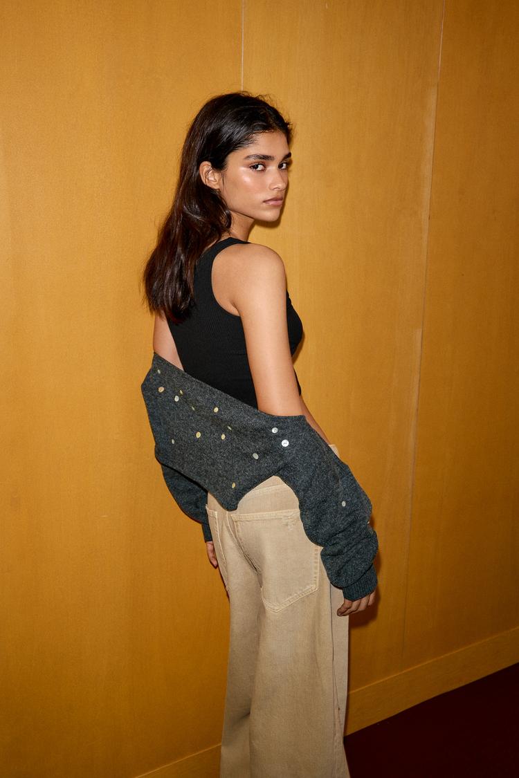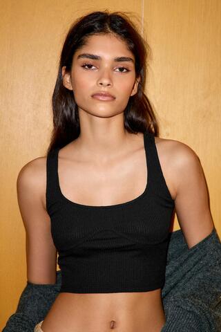 ZARA КРОП-ТОП НА БРЕТЕЛЯХ В РУБЧИК, ЧЕРНЫЙ
