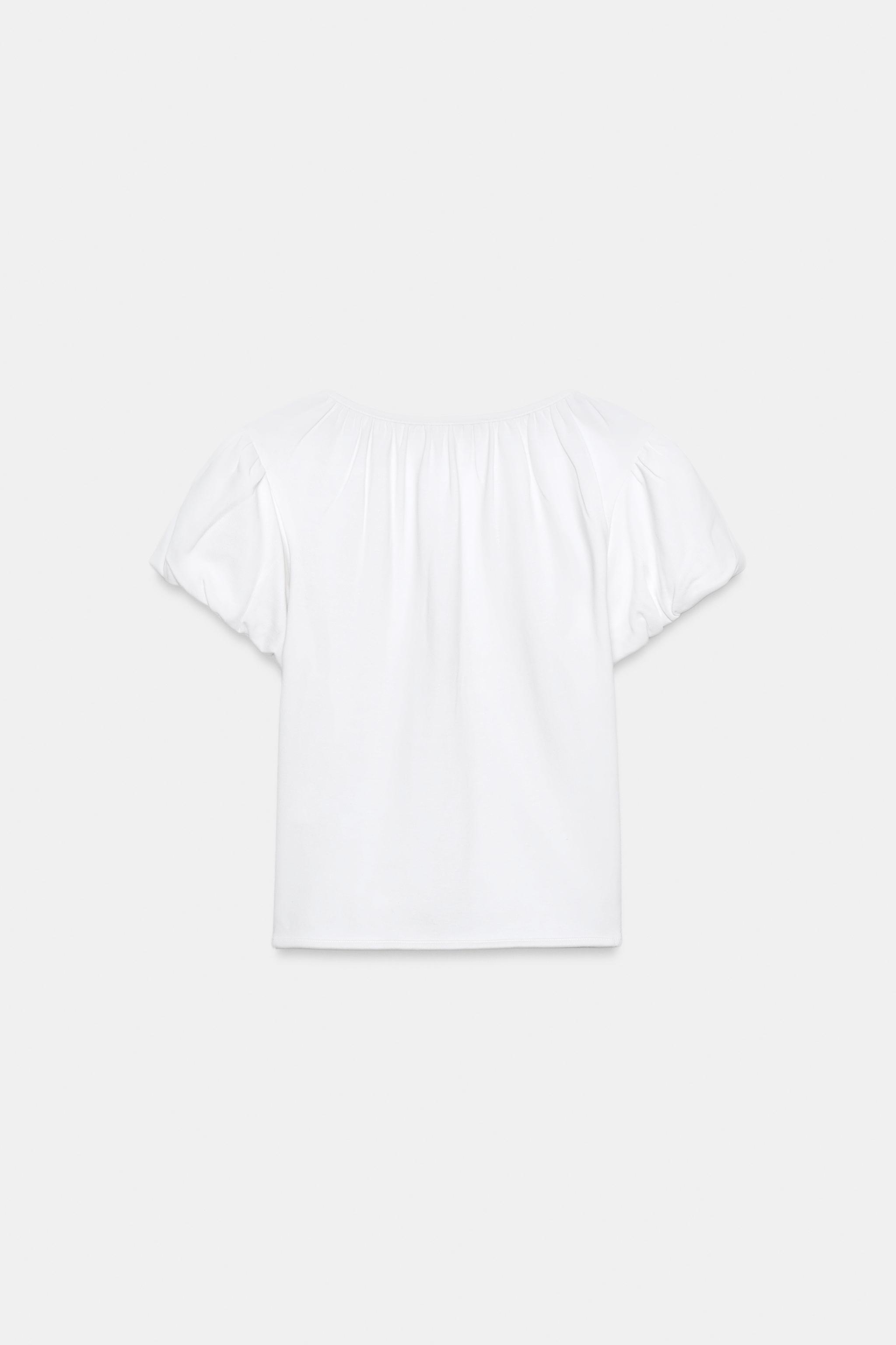 Топ из хлопковой пряжи с V-образным вырезом и короткими объемными рукавами. Сборки, завязки спереди.