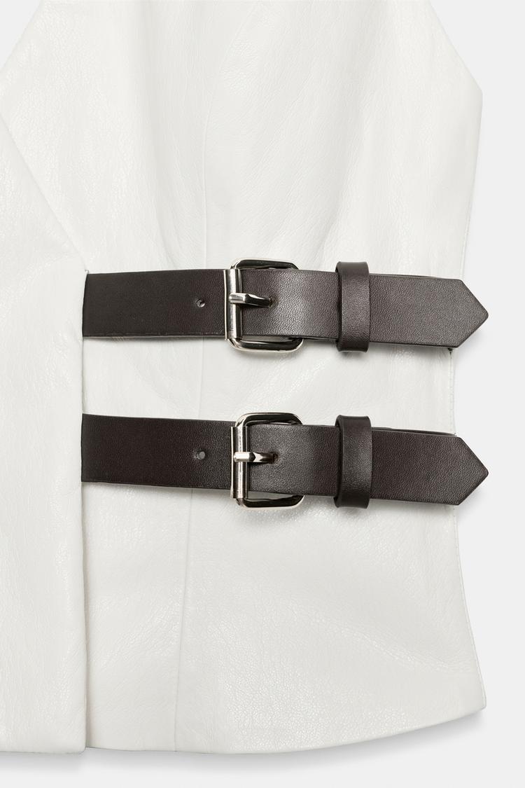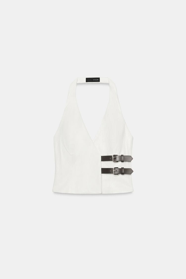 ZARA КРОП-ТОП С ГОРЛОВИНОЙ ХАЛТЕР ИЗ ИСКУССТВЕННОЙ КОЖИ С ПРЯЖКАМИ, ЖЕЛТОВАТО-БЕЛЫЙ