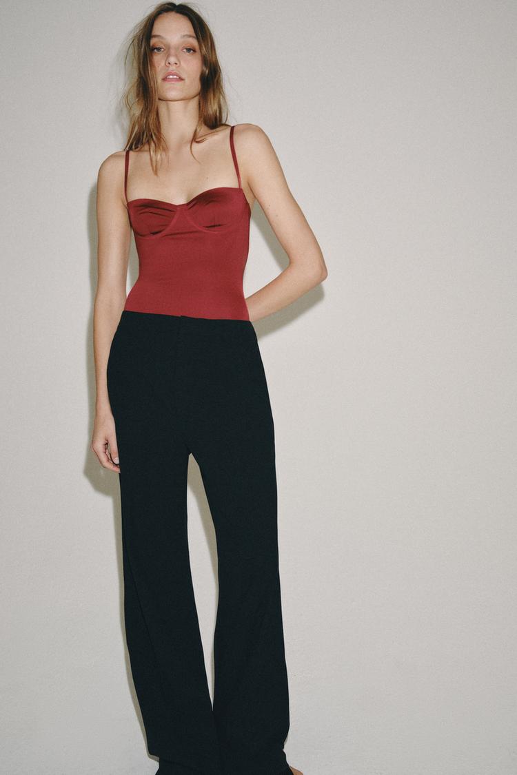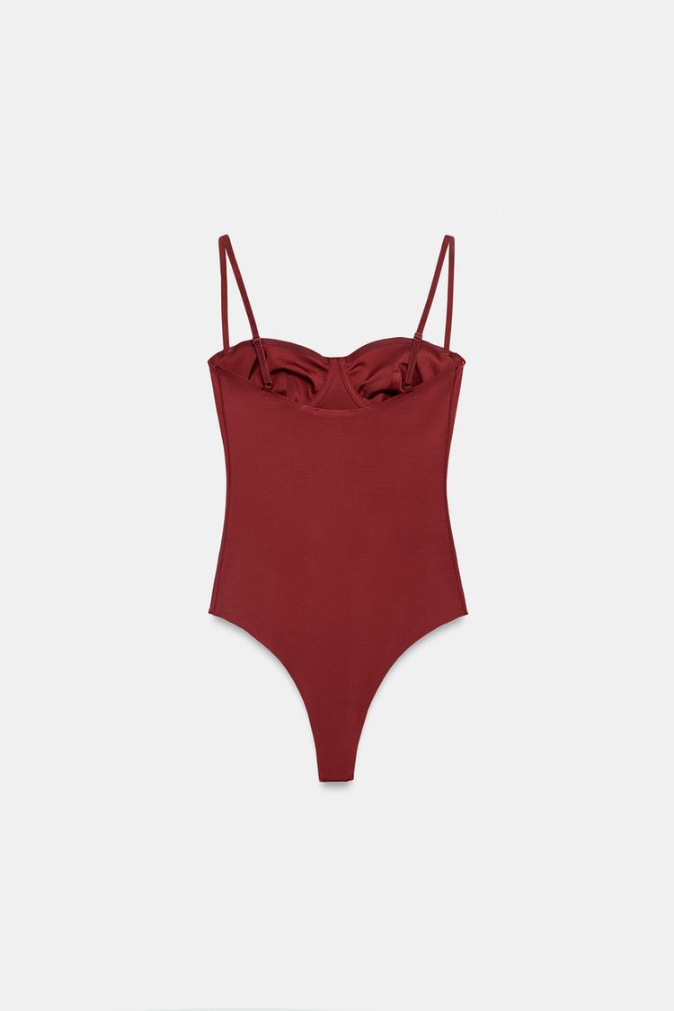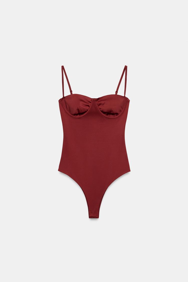 ZARA КРУЖЕВНОЕ БОДИ ИЗ ПОЛИАМИДА, ТЕМНЫЙ ЧЕРЕПИЧНЫЙ