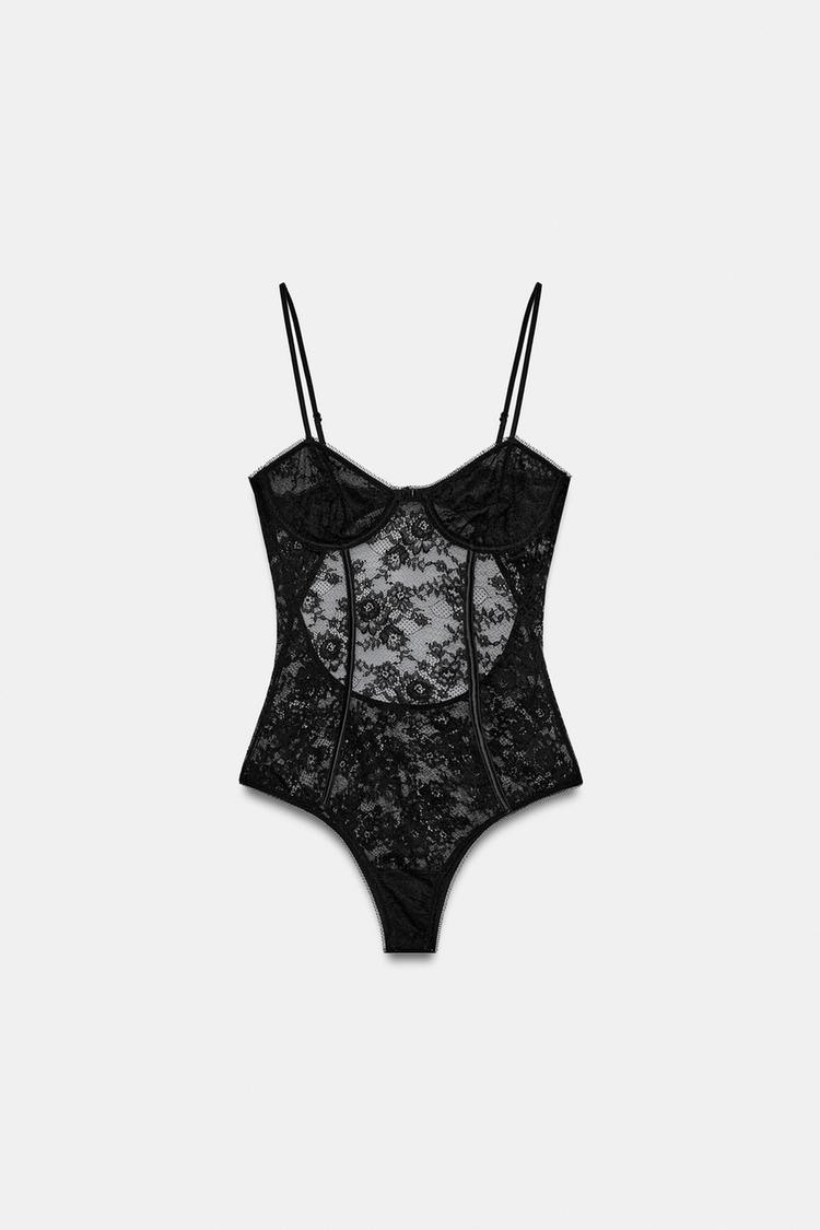 ZARA КРУЖЕВНОЕ БОДИ С ОТКРЫТОЙ СПИНОЙ, ЧЕРНЫЙ