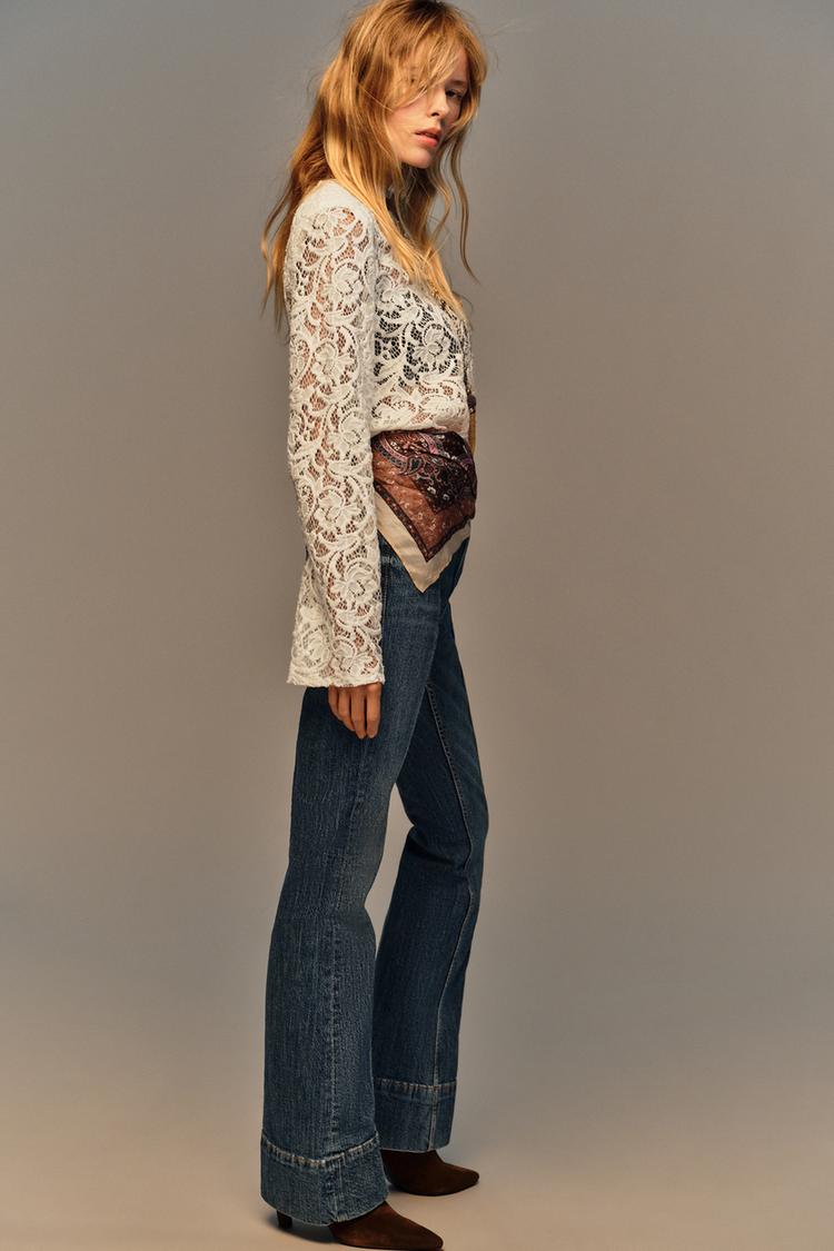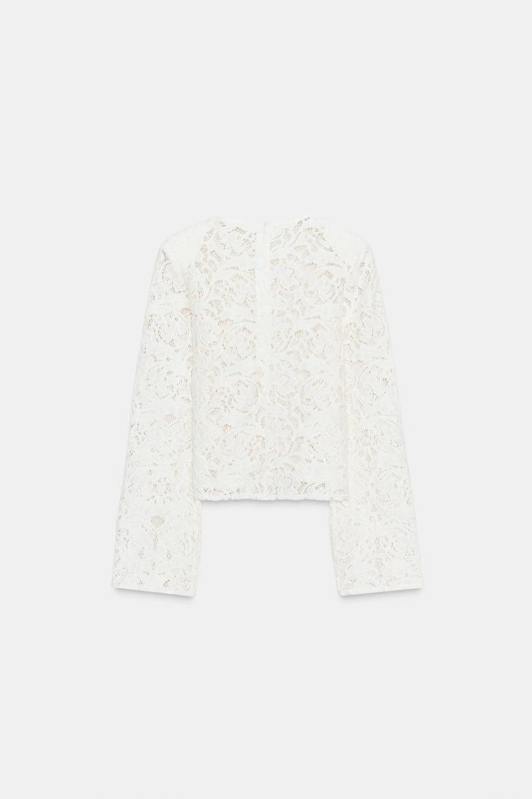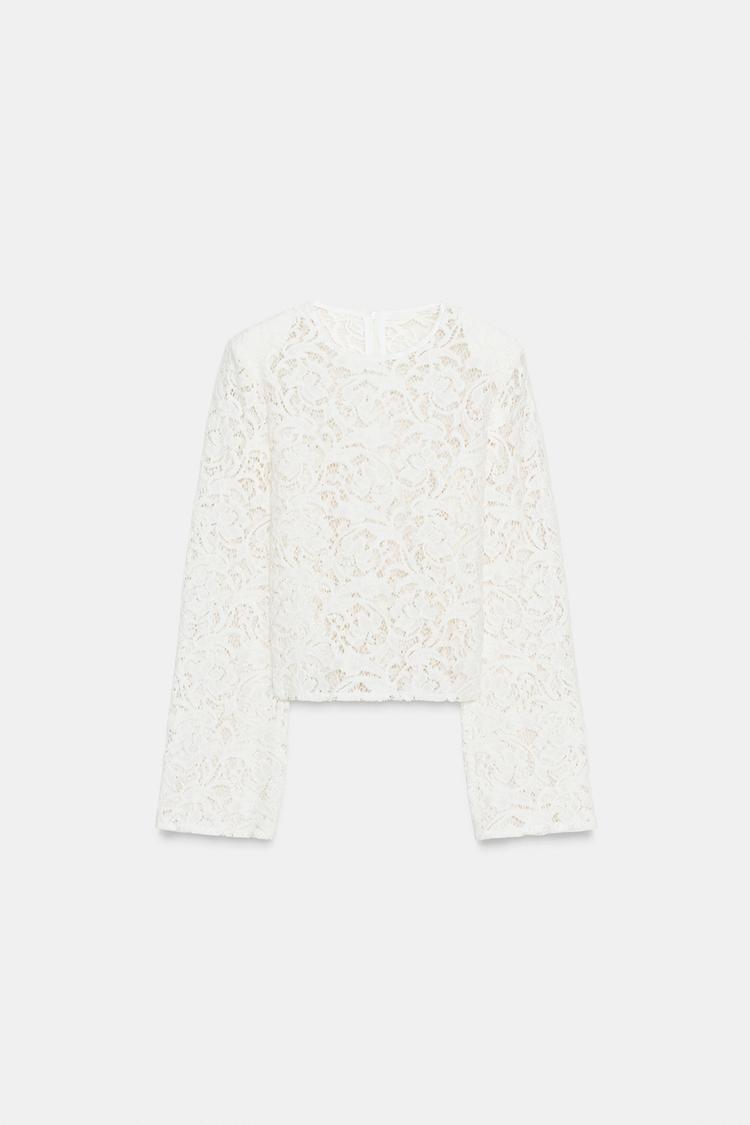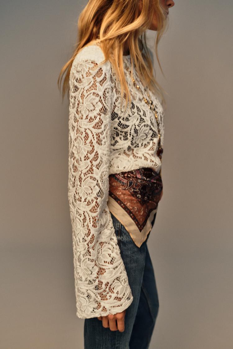 Топ из кружевной ткани. Круглый вырез и длинные рукава с подплечниками. Прямой низ.