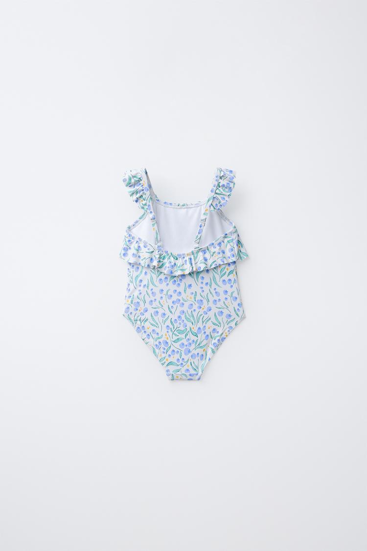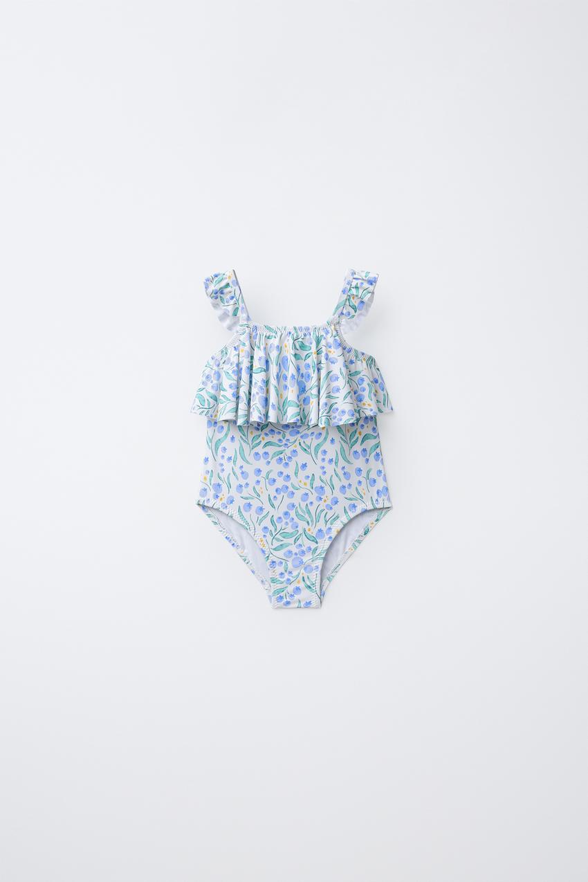 ZARA КУПАЛЬНИК С ВОЛАНАМИ И ПРИНТОМ В ВИДЕ ЛИСТЬЕВ, СИНИЙ