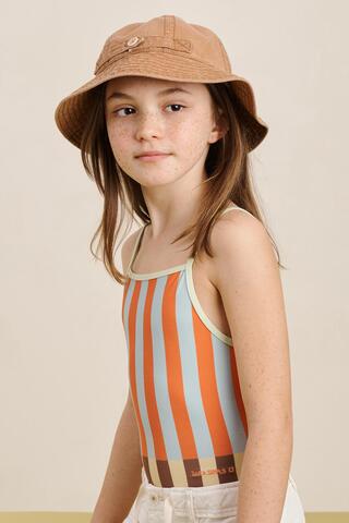 Купальник с полосатым узором, прямым воротником и перекрестными бретелями на спине.