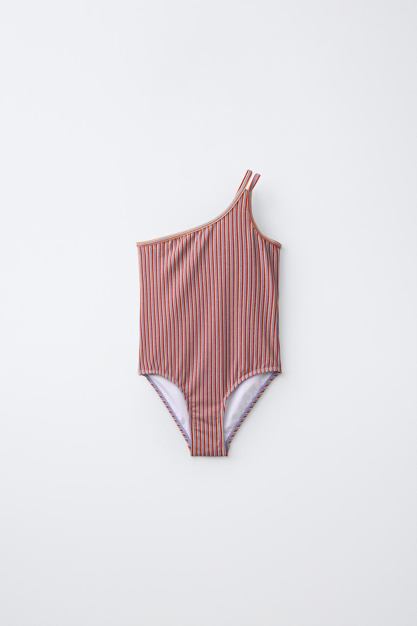 Купальник асимметричного кроя на одно плечо. Блестящий принт в полоску.