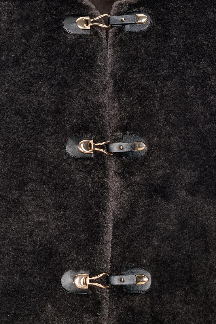 Куртка с круглым вырезом и длинными рукавами. Внешняя часть из искусственного меха, внутренняя — из искусственной замши. Передние прорезные карманы, застежка на навесные петли.