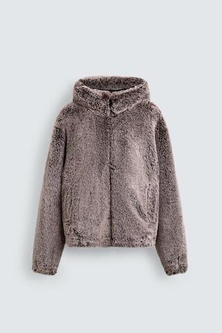 ZARA КУРТКА ИЗ ИСКУССТВЕННОГО МЕХА С КАПЮШОНОМ, СЕРОВАТО-КОРИЧНЕВЫЙ
