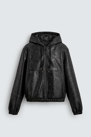 ZARA КУРТКА ИЗ ИСКУССТВЕННОЙ КОЖИ С КАПЮШОНОМ, ЧЕРНЫЙ
