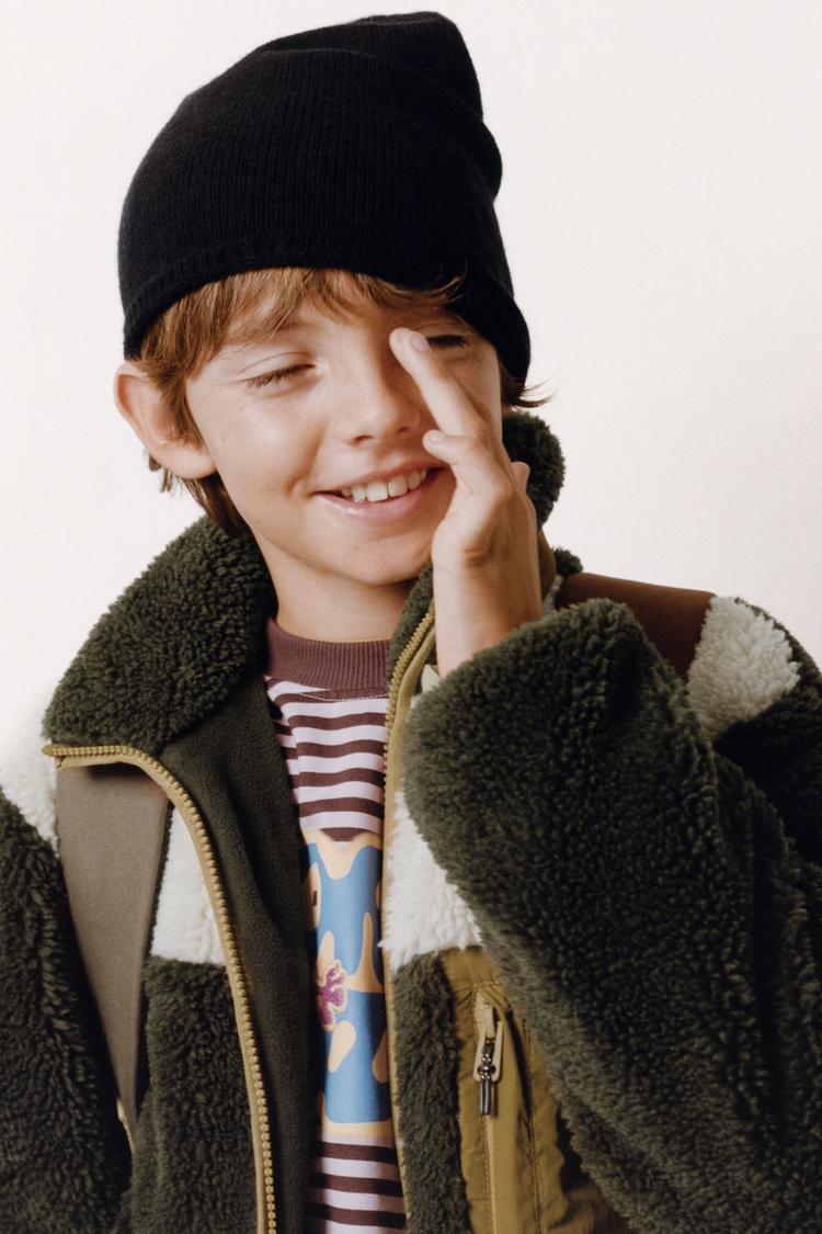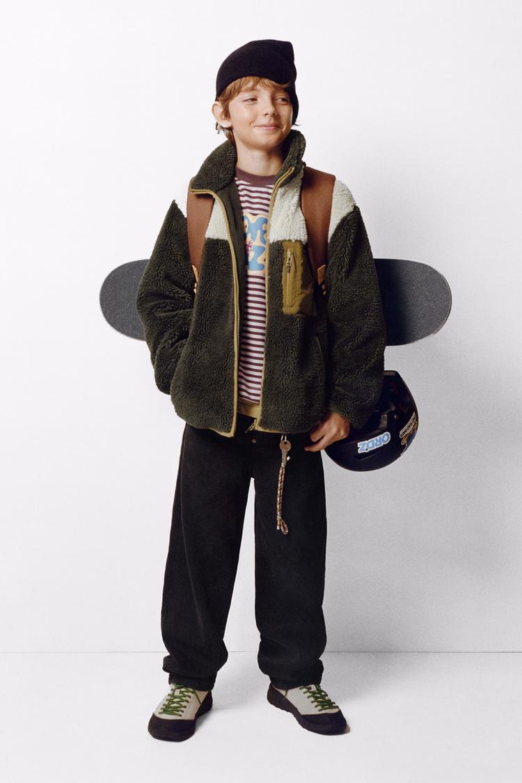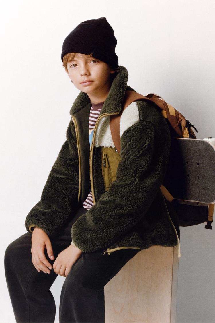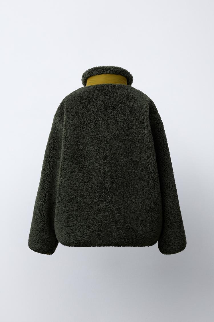 ZARA КУРТКА ИЗ ИСКУССТВЕННОЙ ОВЧИНЫ В СТИЛЕ КОЛОР-БЛОК, ХАКИ