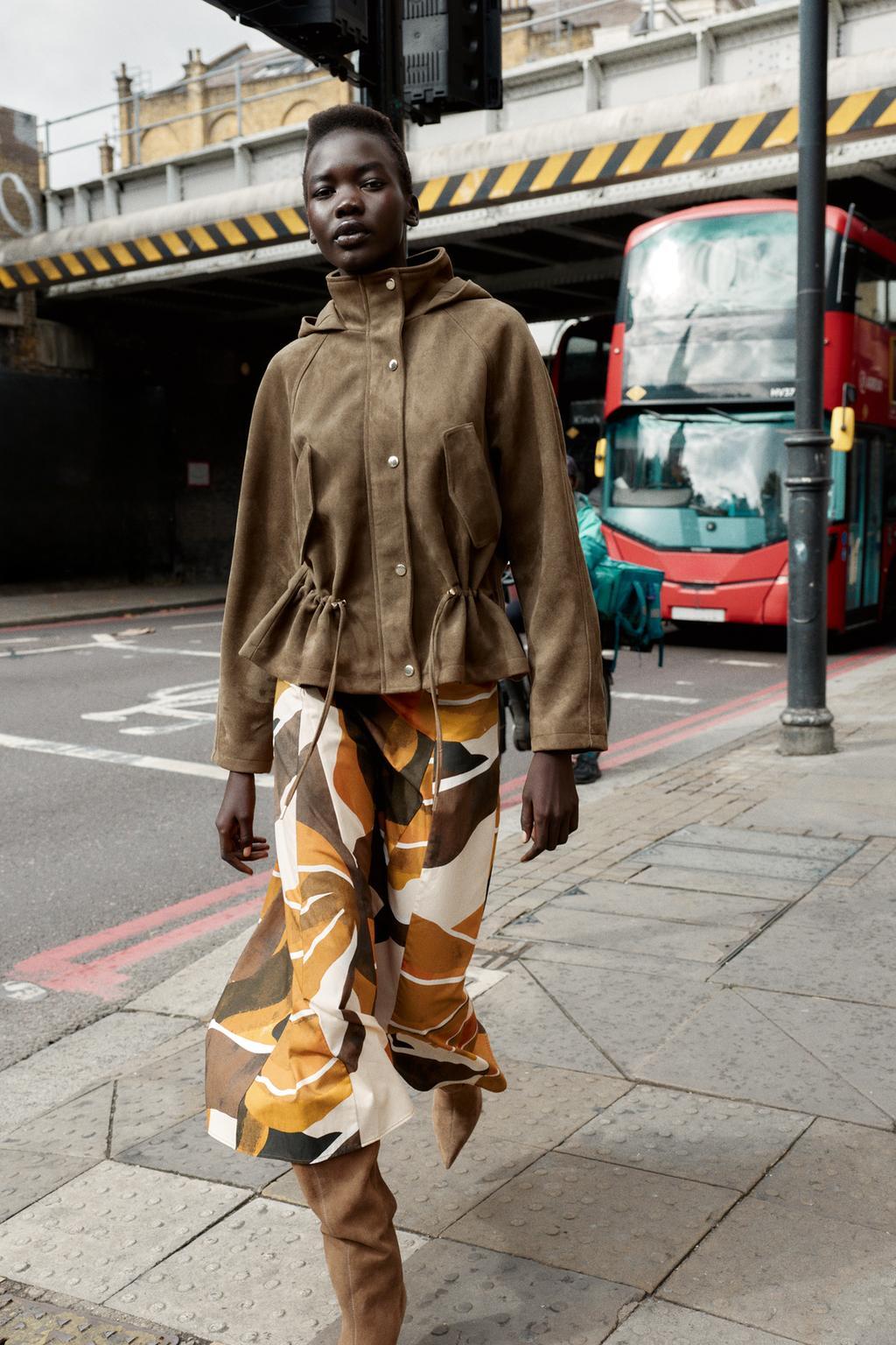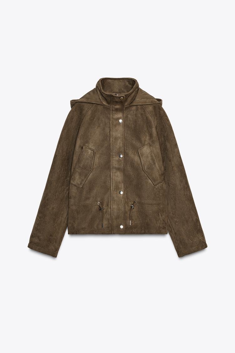 ZARA КУРТКА ИЗ ИСКУССТВЕННОЙ ЗАМШИ С КАПЮШОНОМ, СВЕТЛЫЙ ХАКИ