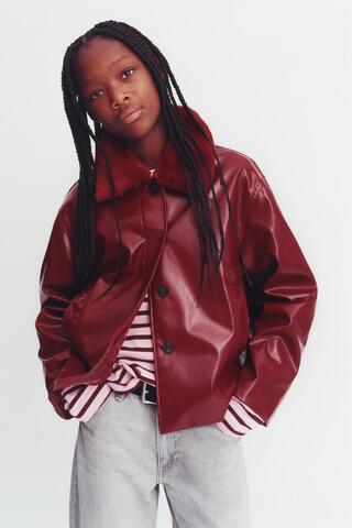ZARA КУРТКА ИЗ ЛАКИРОВАННОЙ ТКАНИ СО СЪЕМНЫМ ВОРОТНИКОМ, БУРГУНДИ