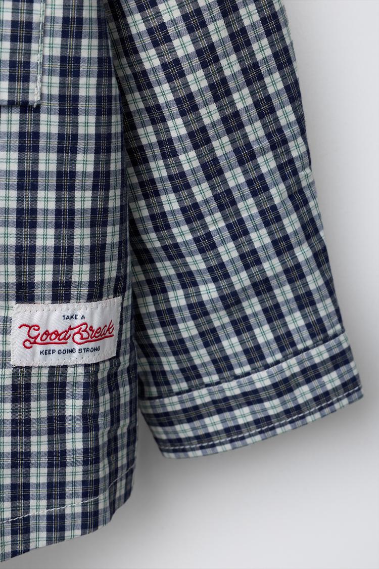 Куртка-рубашка с капюшоном и длинными рукавами. Застегивается на пуговицы. Передние накладные карманы с клапанами. Ткань в клетку, нашивка на подоле.