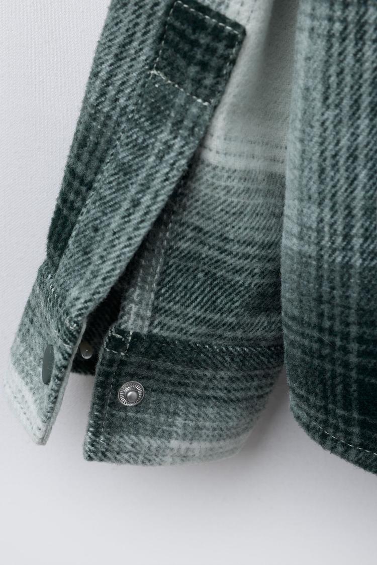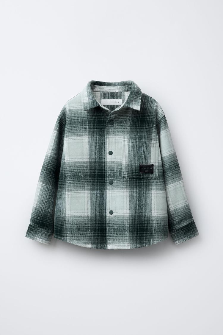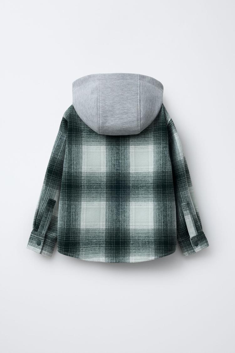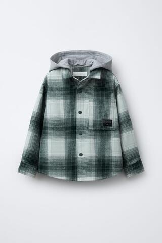 ZARA КУРТКА-РУБАШКА В КЛЕТКУ С ОТСТЕГИВАЮЩИМСЯ ФЛИСОВЫМ КАПЮШОНОМ, ЗЕЛЕНЫЙ