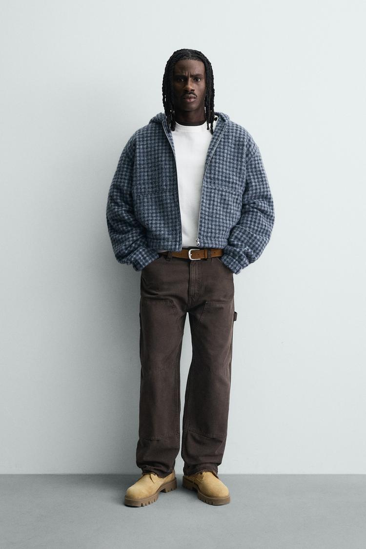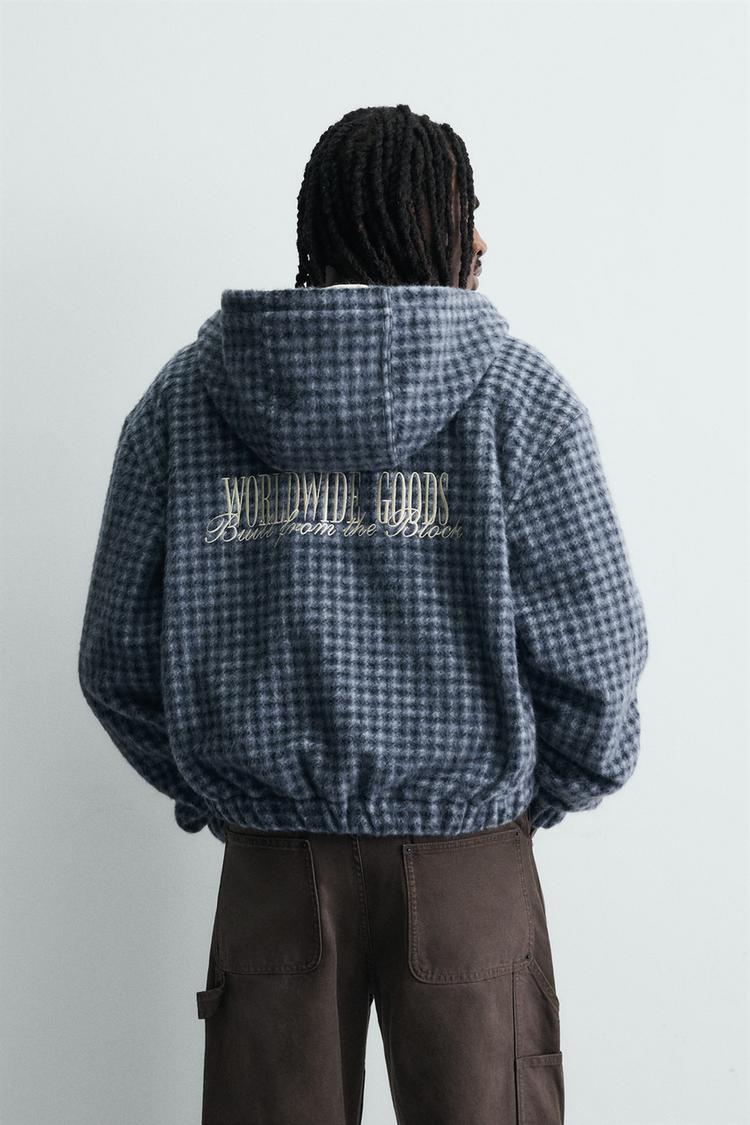 ZARA КУРТКА-РУБАШКА В КЛЕТКУ С ВЫШИВКОЙ И КАПЮШОНОМ, СИНИЙ/ЧЕРНЫЙ