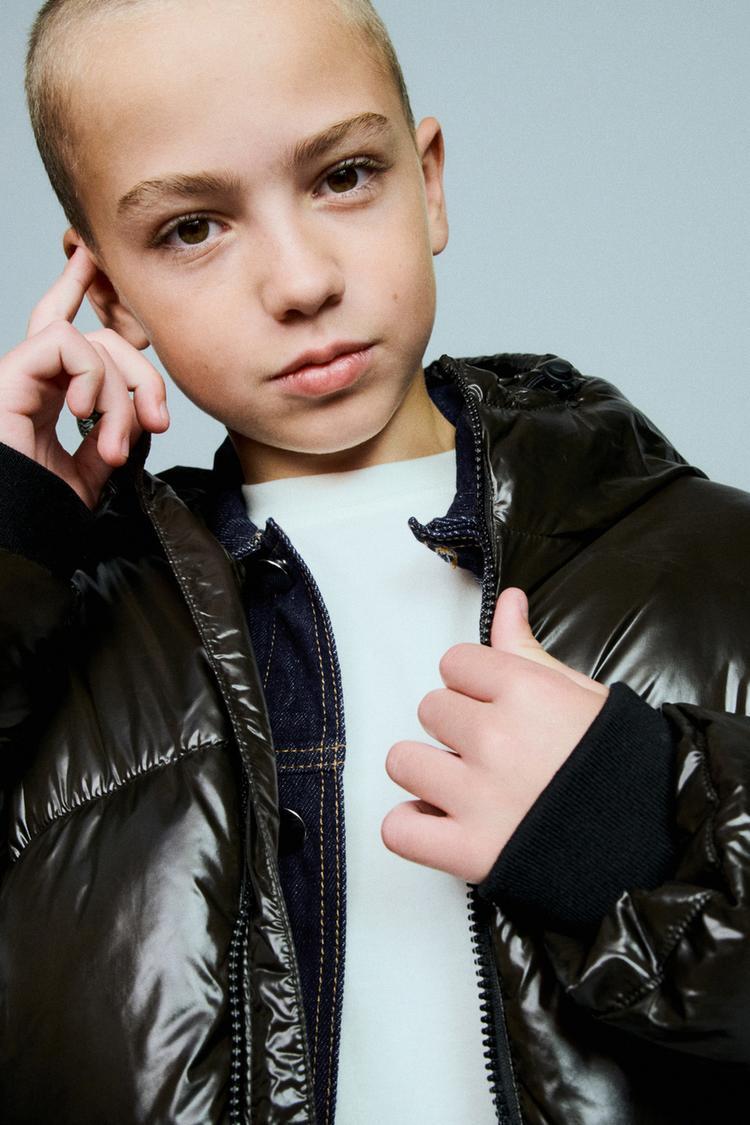 Стеганое пальто из специальной водоотталкивающей ткани. С капюшоном, стопперами и длинными рукавами с внутренними манжетами. Застежка-молния спереди. Карманы с окантовкой спереди и застежкой на кнопку. Текстовый принт на рукаве и техническая ткань с блестящей отделкой.