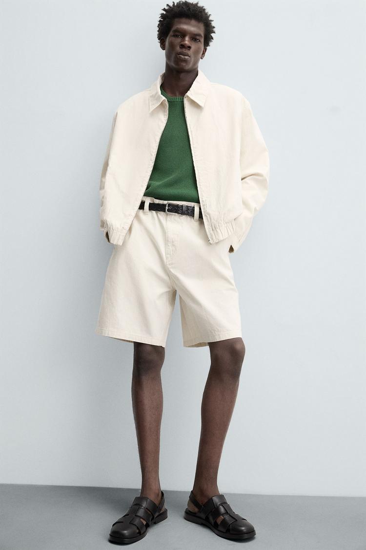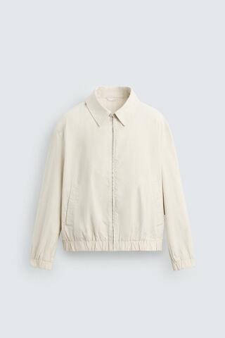 Куртка свободного кроя из хлопковой ткани в полоску. Воротник с лацканами, длинные рукава с эластичными манжетами. Передние прорезные карманы. Эластичный низ. Эффект потертости. Застежка-молния.