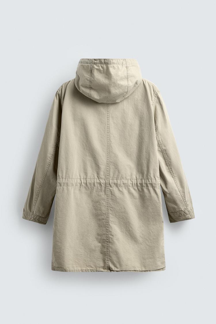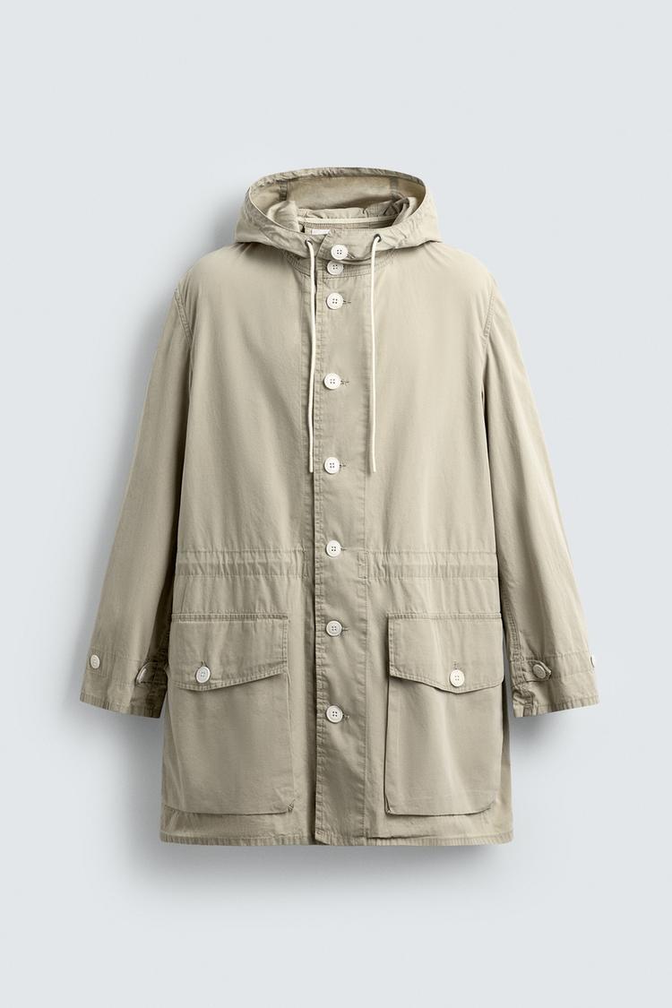 Парка стандартного кроя из легкой хлопковой ткани. Воротник-стойка с регулируемым капюшоном и застежкой на пуговицы. Длинные рукава с регулируемыми манжетами на хлястиках. Накладные карманы с клапанами на бедрах. Регулируемая талия с внутренней кулиской. Эффект стирки. Застежка на пуговицы спереди.