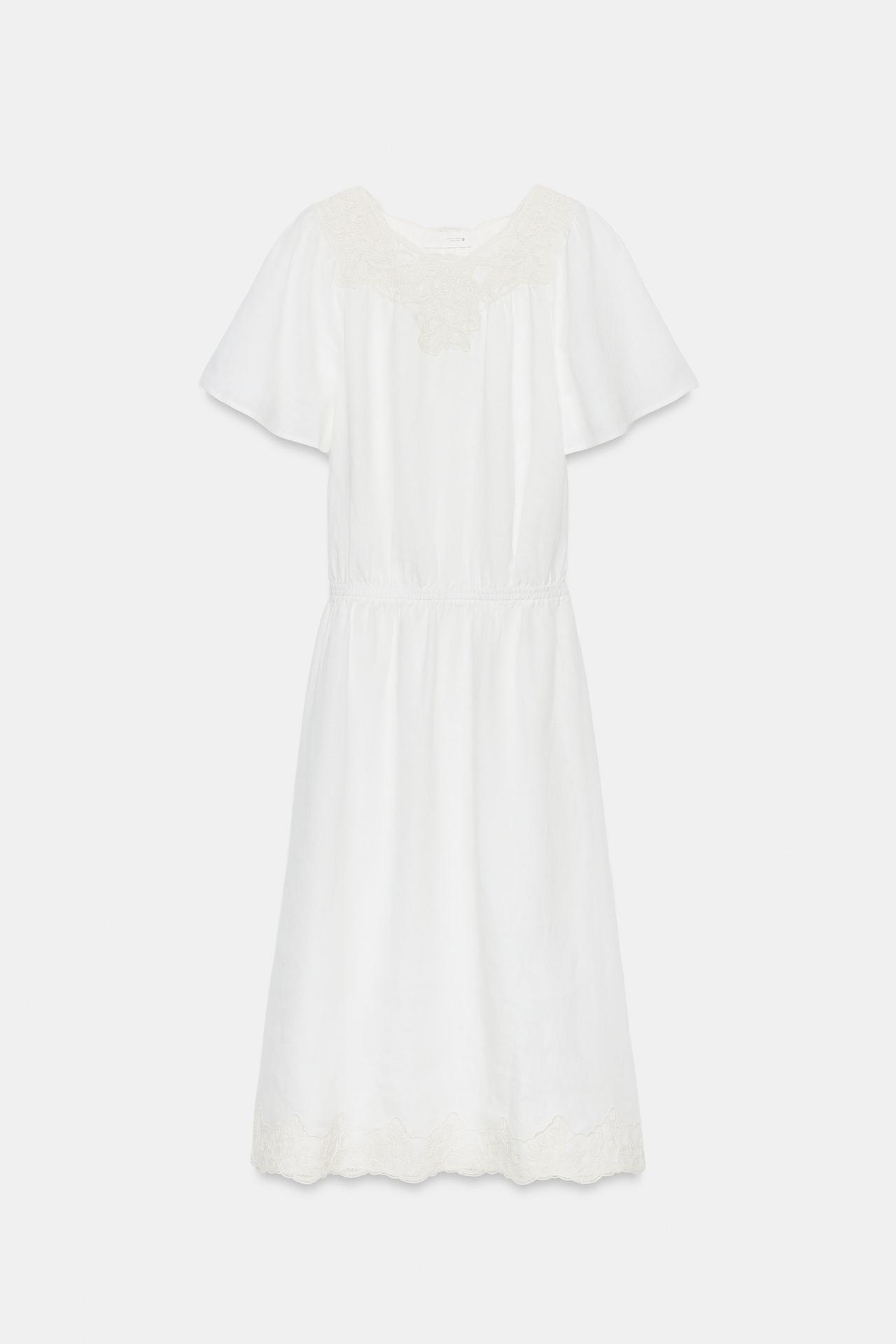 Платье миди из 100% льна. Круглый вырез, короткие рукава, эластичная талия. Контрастные вязаные элементы. Прямой подол.