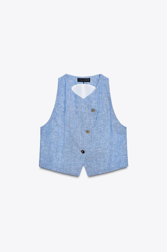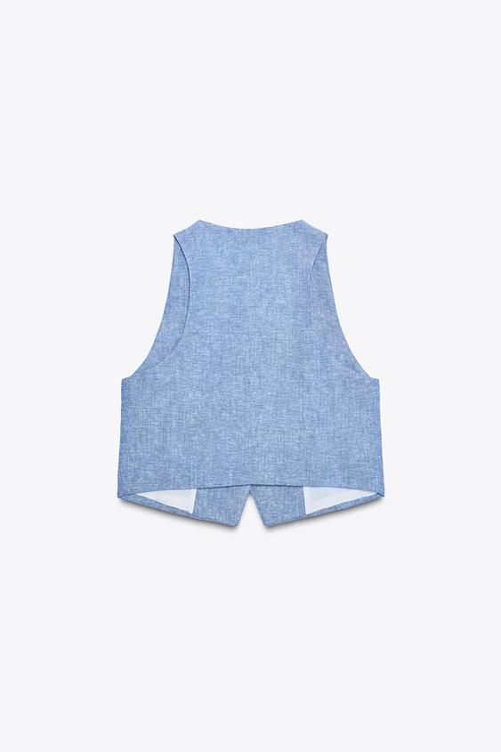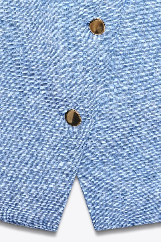 ZARA ЛЬНЯНОЙ ЖИЛЕТ ВНАХЛЕСТ, ГОЛУБОЙ