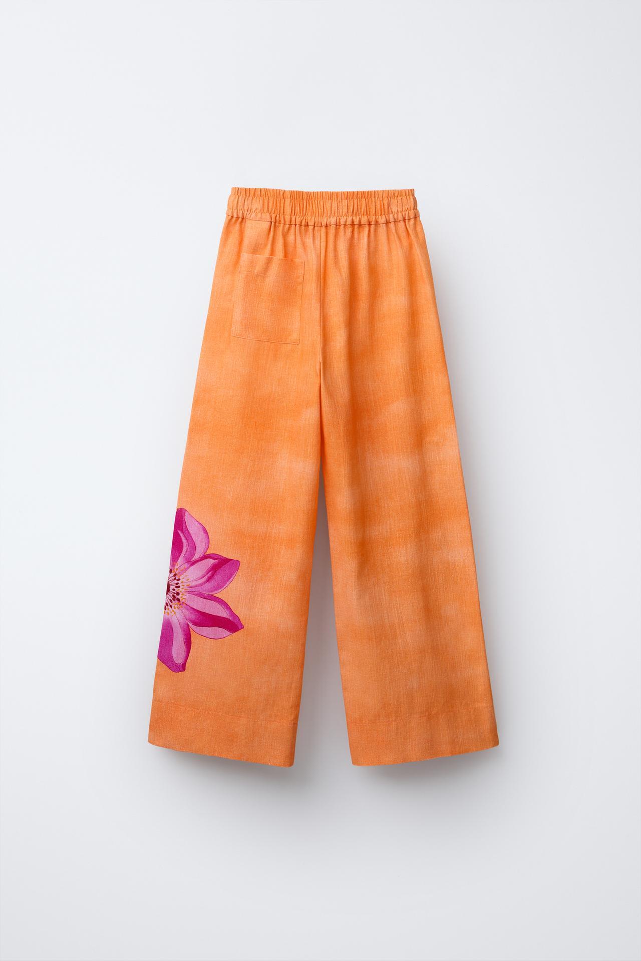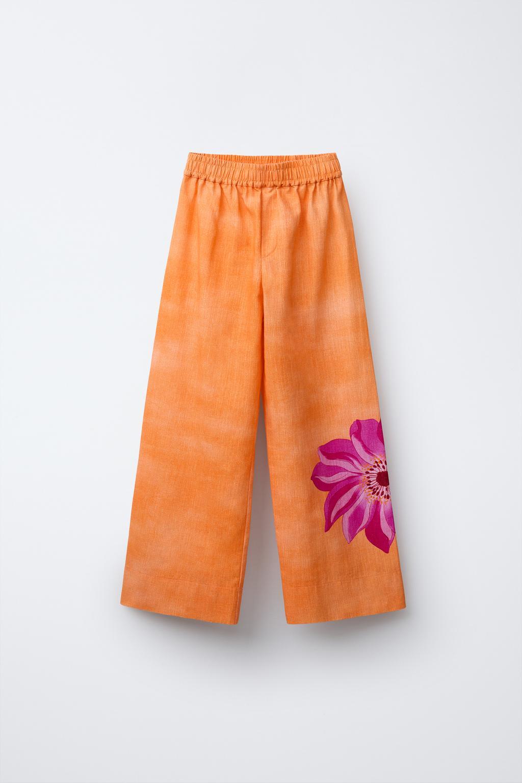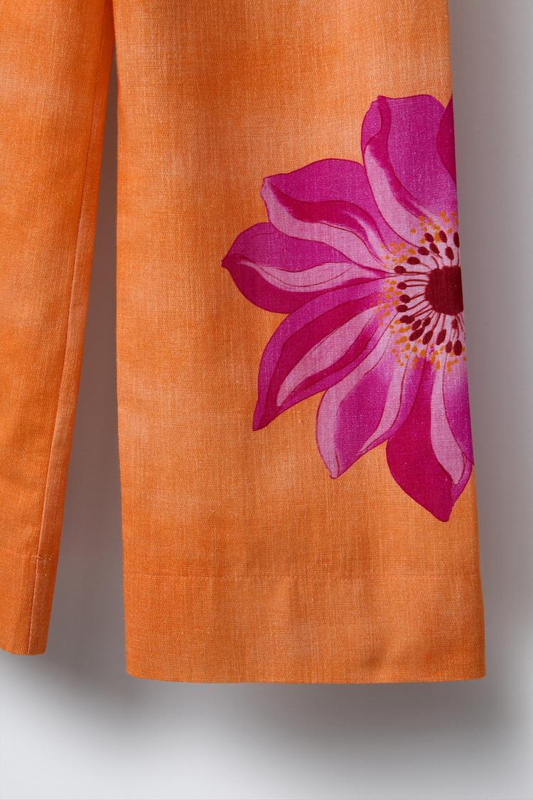 ZARA ЛЬНЯНЫЕ БРЮКИ ПРЯМОГО КРОЯ С ЦВЕТОЧНЫМ ПРИНТОМ, ОРАНЖЕВЫЙ