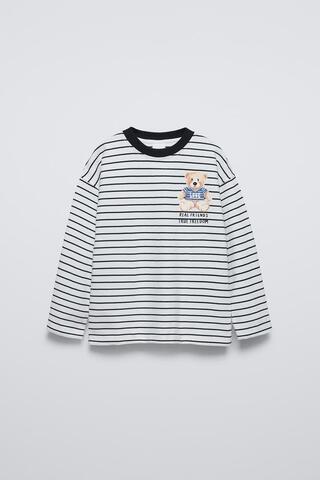 ZARA ЛОНГСЛИВ ИЗ ТКАНИ В ПОЛОСКУ С ПРИНТОМ «МЕДВЕДЬ», БЕЛЫЙ/ЧЕРНЫЙ