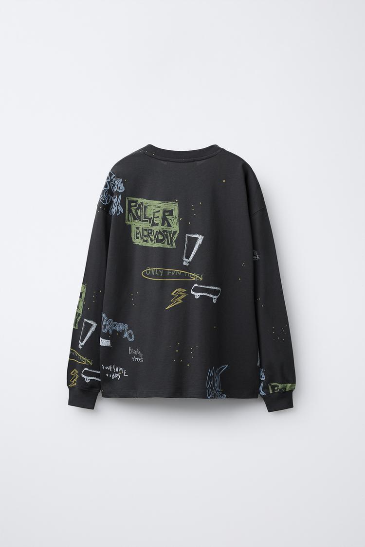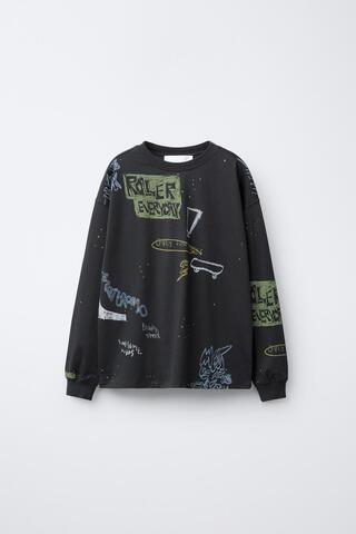 ZARA ЛОНГСЛИВ С ПРИНТОМ ГРАФФИТИ, ТЕМНЫЙ АНТРАЦИТ