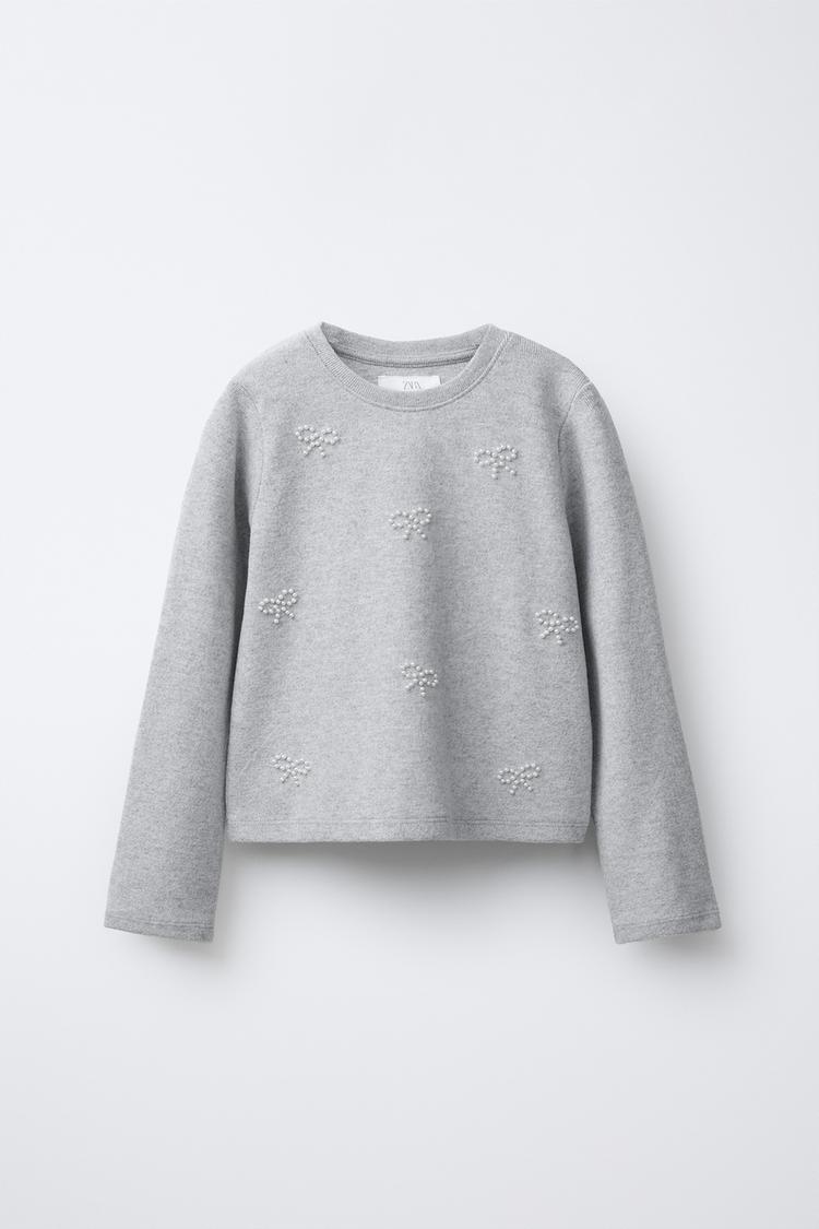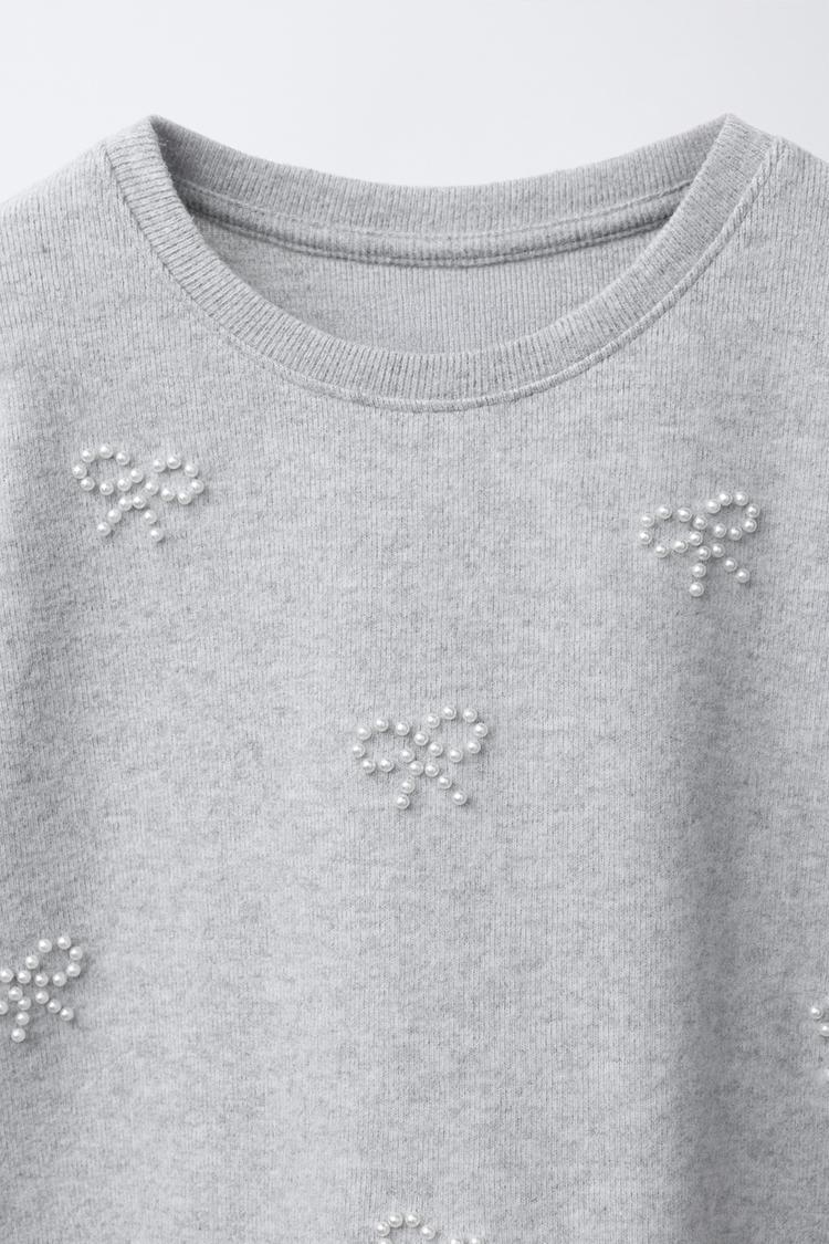 ZARA ЛОНГСЛИВ SOFT TOUCH С БАНТАМИ И БУСИНАМИ, ЖЕМЧУЖНО-СЕРЫЙ