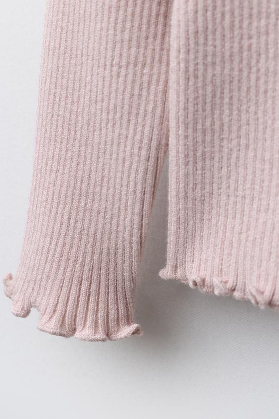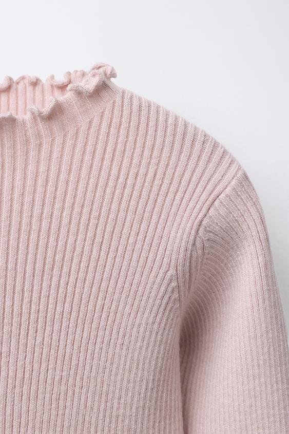 Джерси в рубчик с высоким воротником и длинными рукавами. Отделка в рубчик.