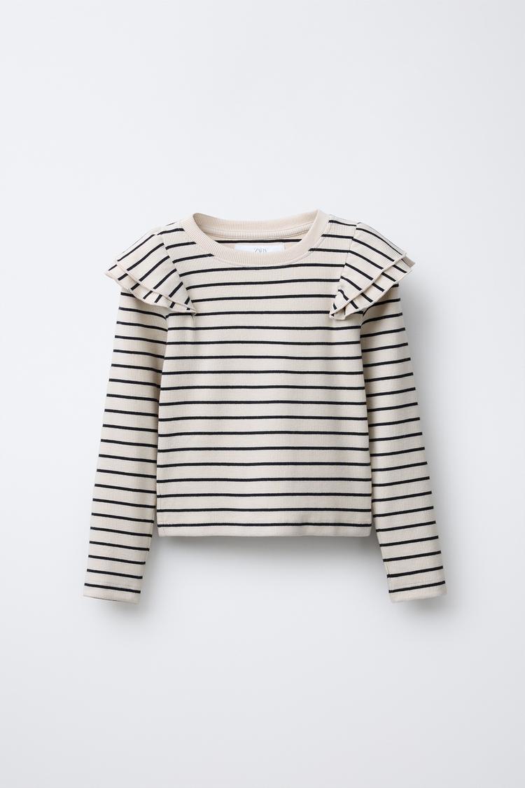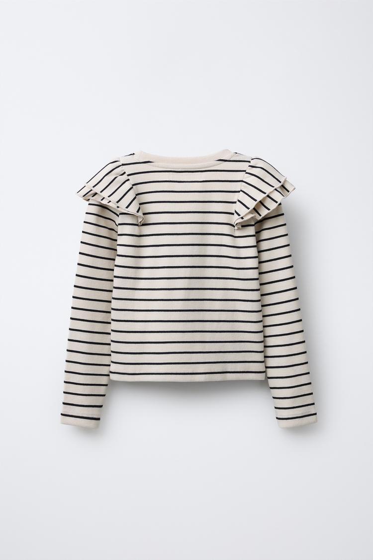 Лонгслив с круглым вырезом и длинными рукавами. Воланы на плечах. Принт в полоску. Ткань: 95% хлопок.