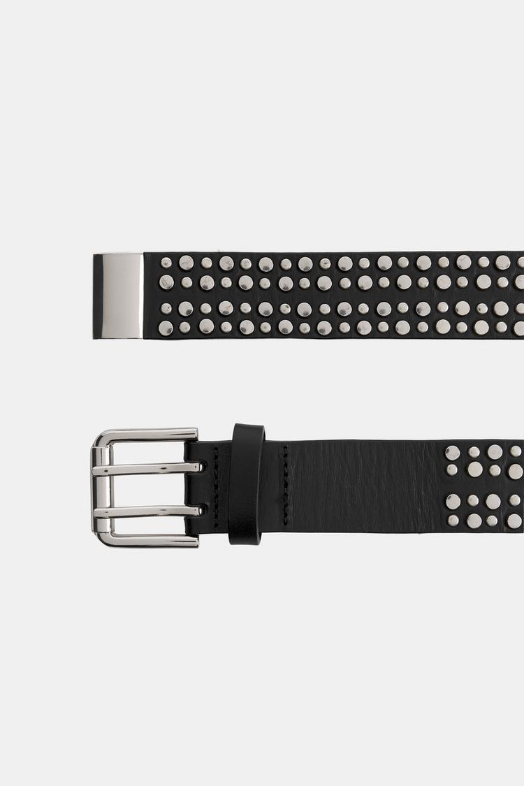 Длинный ремень из кожи. Застежка на металлическую пряжку и петлю. Контрастные металлические аппликации.