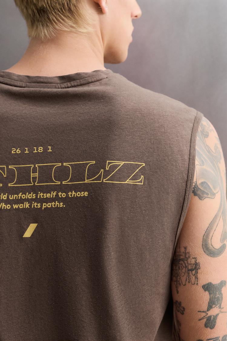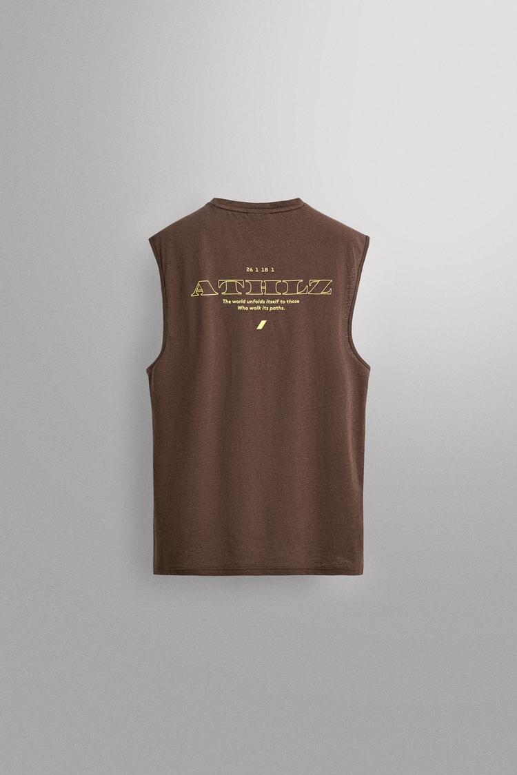 Майка свободного кроя из смеси хлопка и льна. Круглый вырез и проймы. Контрастные принты спереди и сзади.Zara Athleticz.