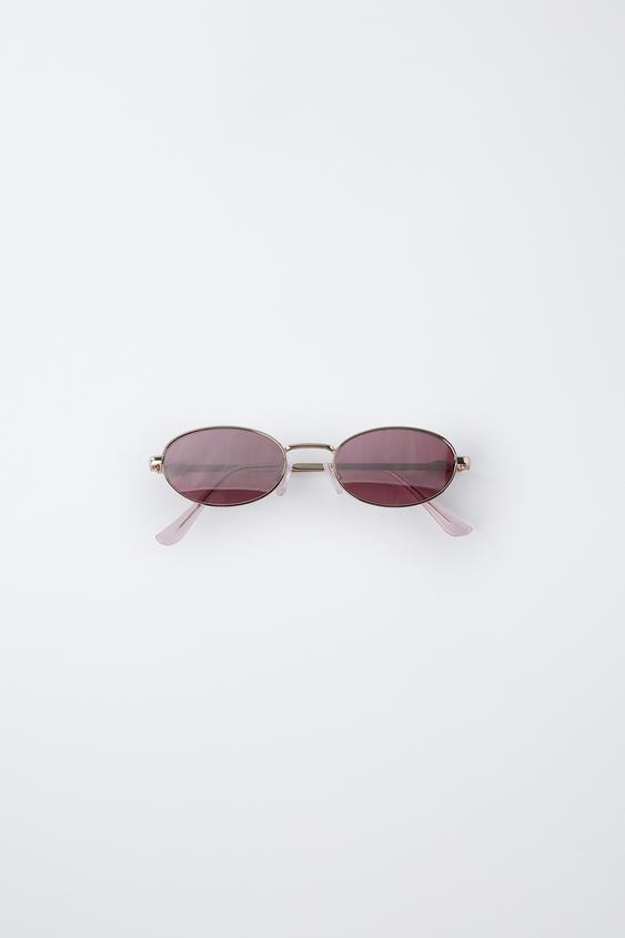 Солнцезащитные очки в овальной металлической оправе с линзами розового цвета.