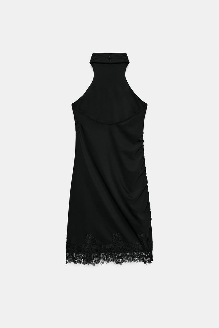 ZARA МИНИ-ПЛАТЬЕ ХАЛТЕР С КРУЖЕВОМ, ЧЕРНЫЙ