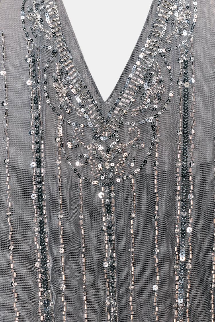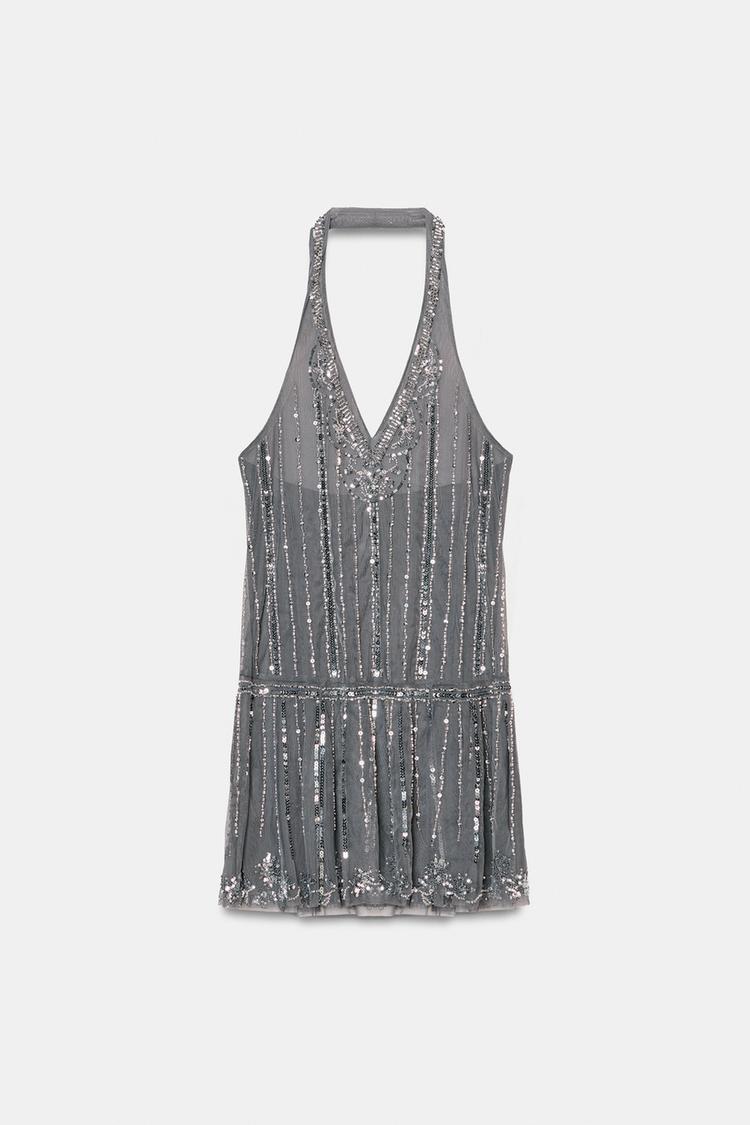 ZARA МИНИ-ПЛАТЬЕ ХАЛТЕР С ПАЙЕТКАМИ, ТЕМНО-СЕРЫЙ